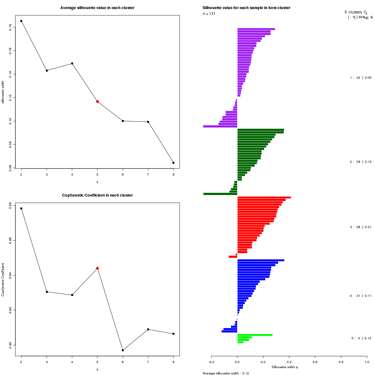Figure 3. Get High-res Image The silhouette width was calculated for each sample and each value of k. The left upper panel shows the average silhouette width across all samples for each tested k (left upper panel). The left lower panel shows the Cophenetic Correlation Coefficients for each tested k. The right panel shows assignments of clusters to samples and the silhouette width of each sample for the most robust clustering.