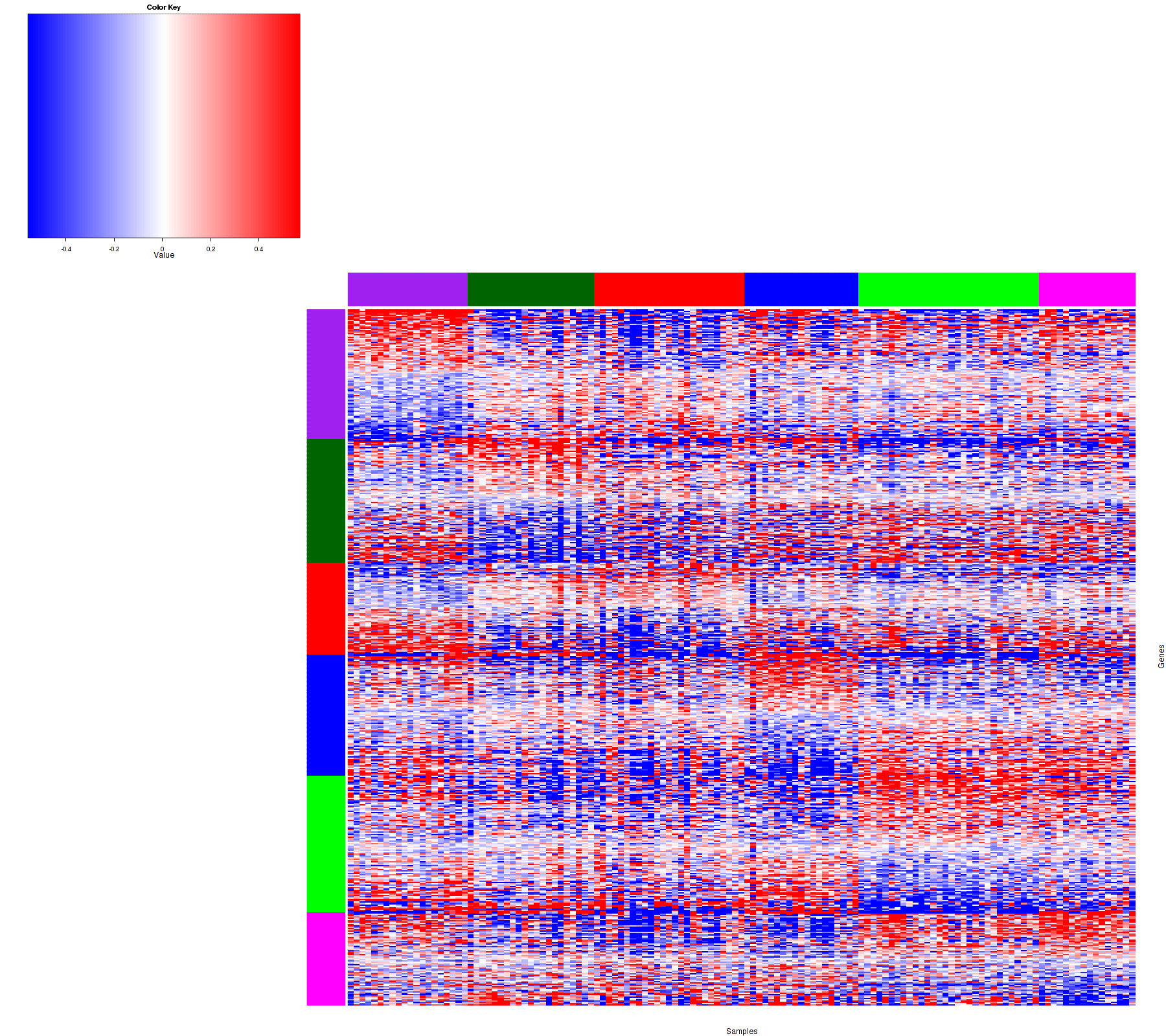 Figure 1. Get High-res Image Samples were separated into 6 clusters. Shown are 131 samples and 536 marker proteins. The color bar of the row indicates the marker proteins for the corresponding cluster.