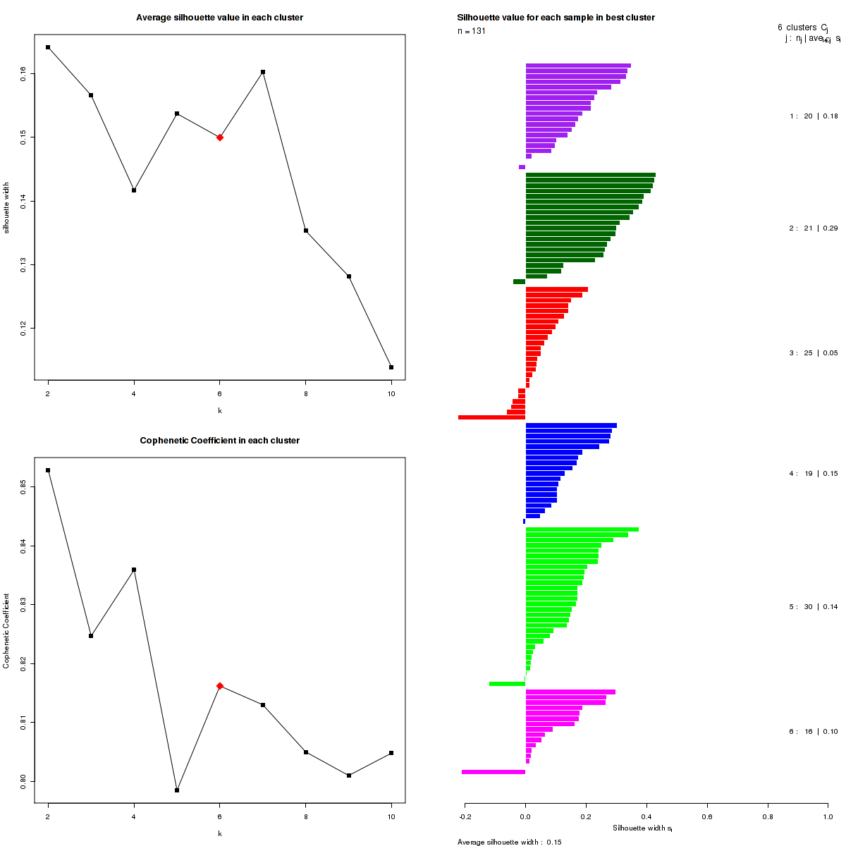 The cophenetic correlation coefficients and average silhouette values are used to determine the k with the most robust clusterings. From the plot of cophenetic correlation versus k, we select modes and the the point preceding the greatest decrease in cophenetic correlation coefficient, and from these choose the k with the highest average silhouette value.