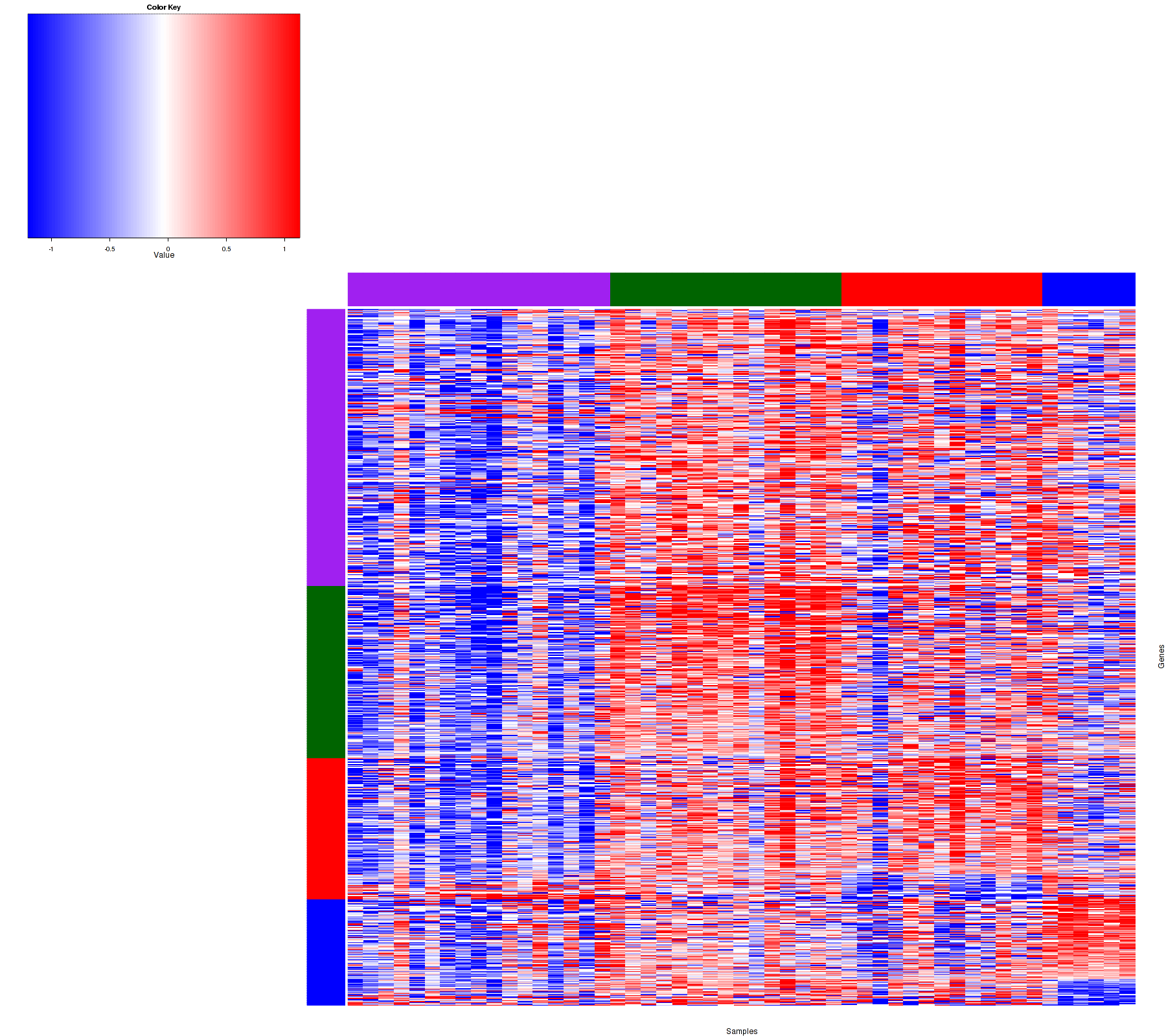 Figure 1. Get High-res Image Samples were separated into 4 clusters. Shown are 51 samples and 788 marker miRs. The color bar of the row indicates the marker miRs for the corresponding cluster.