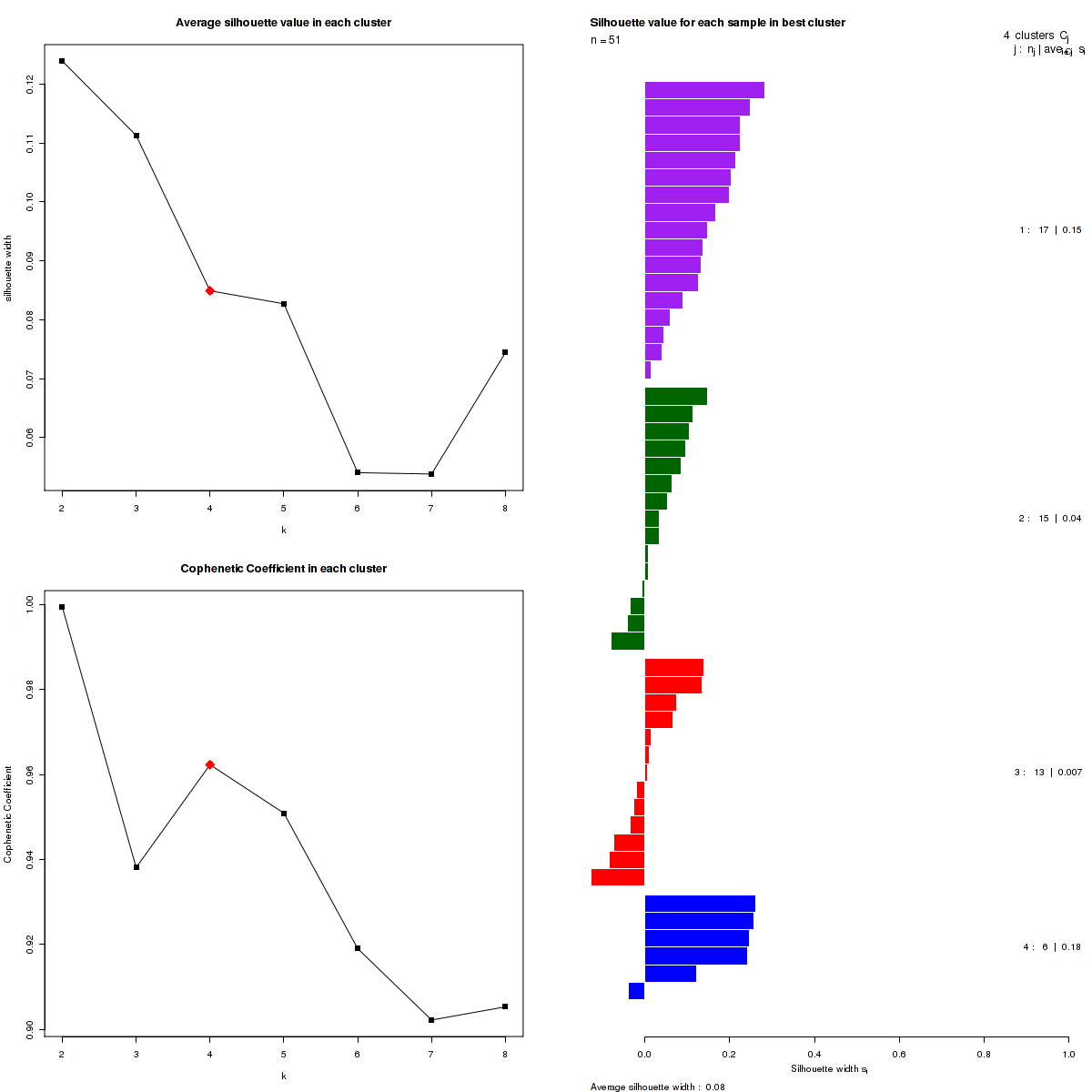 Figure 3. Get High-res Image The silhouette width was calculated for each sample and each value of k. The left upper panel shows the average silhouette width across all samples for each tested k (left upper panel). The left lower panel shows the Cophenetic Correlation Coefficients for each tested k. The right panel shows assignments of clusters to samples and the silhouette width of each sample for the most robust clustering.