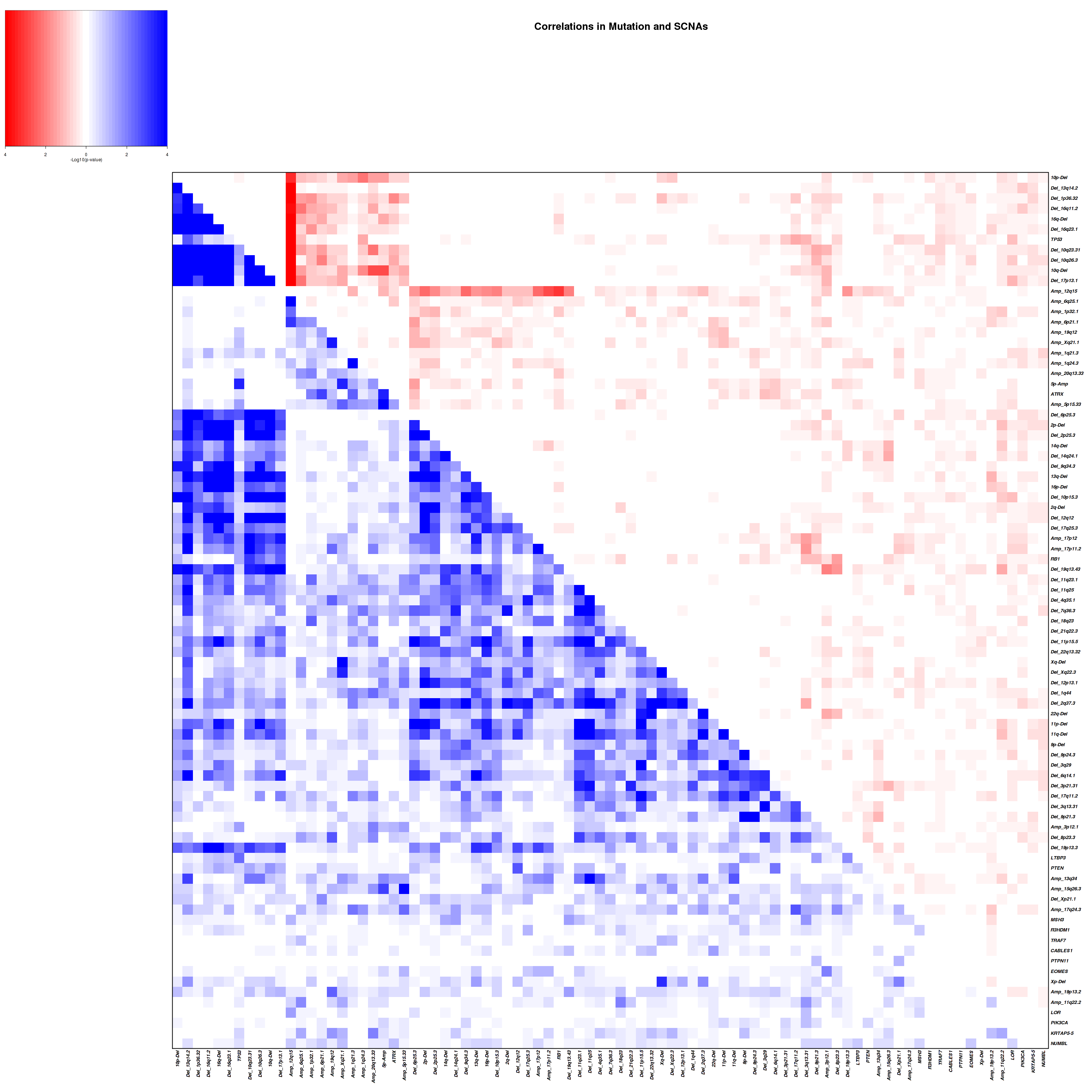 Figure 4. Get High-res Image Co-occurring and mutually-exclusive pairs for all copy number and mutation events. Blue means two events are co-occurring and red means two events are mutually-exclusive.
