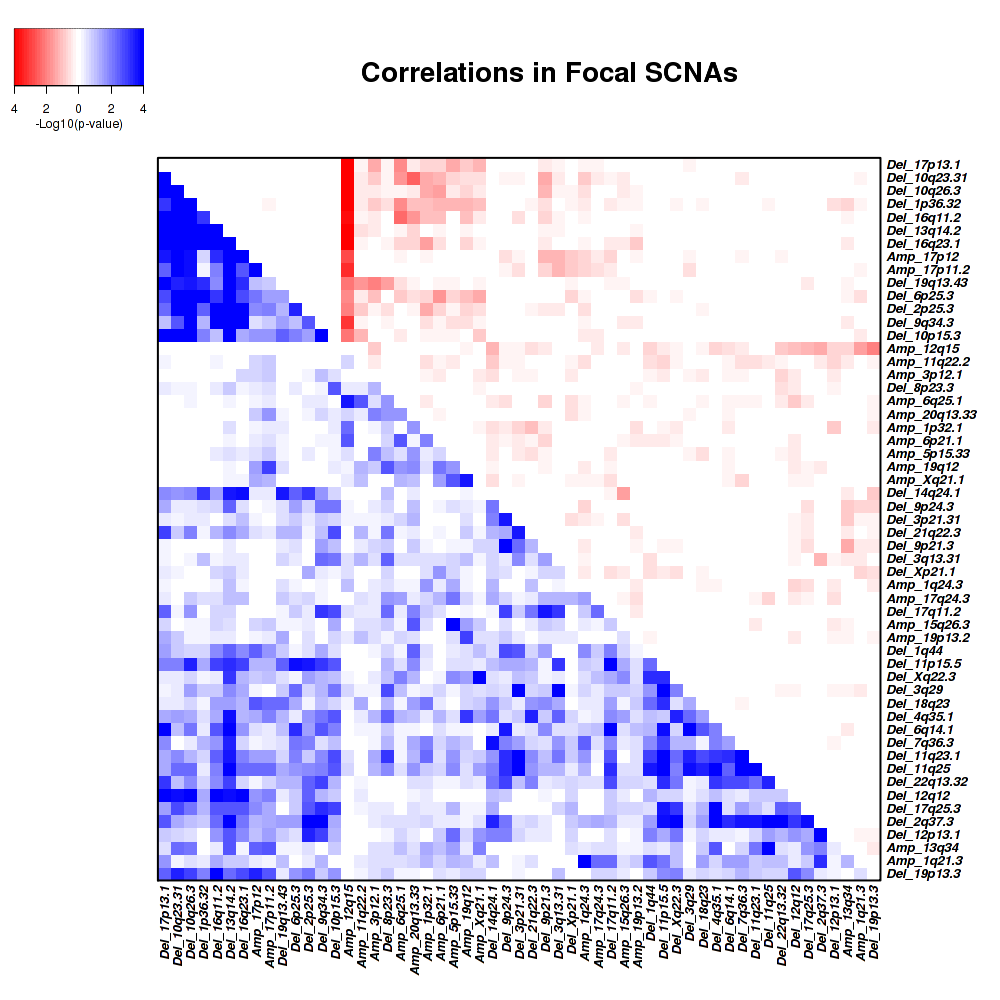 Figure 2. Get High-res Image Co-occurring and mutually-exclusive pairs for copy number variations of focal events. Blue means two events are co-occurring and red means two events are mutually-exclusive.
