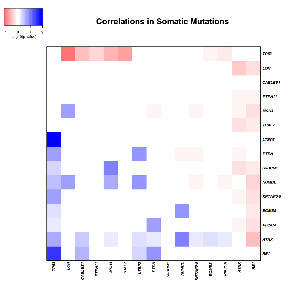 Figure 3. Get High-res Image Co-occurring and mutually-exclusive pairs for significantly mutated genes. Blue means two events are co-occurring and red means two events are mutually-exclusive.