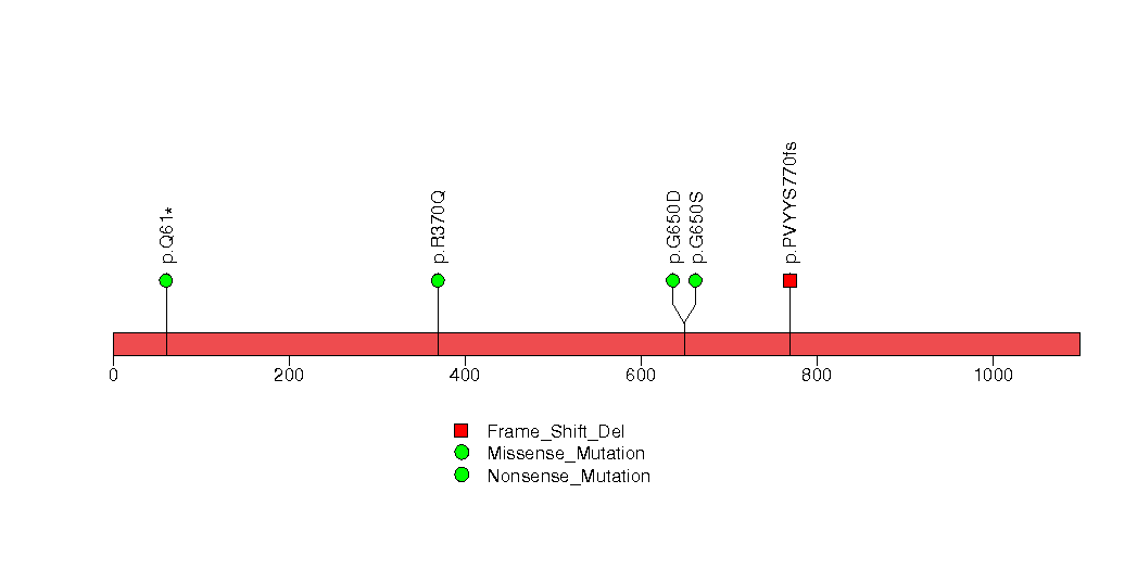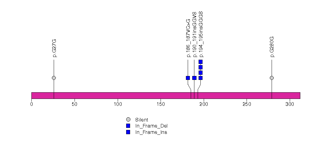 Figure S9. This figure depicts the distribution of mutations and mutation types across the KRTAP5-5 significant gene.