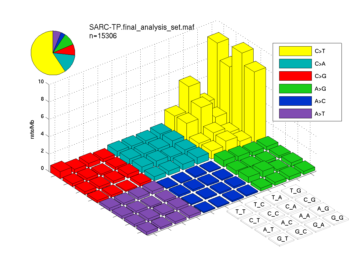 Figure 1. Get High-res Image SNV Mutation rate lego plot for entire set. Each bin is normalized by base coverage for that bin. Colors represent the six SNV types on the upper right. The three-base context for each mutation is labeled in the 4x4 legend on the lower right. The fractional breakdown of SNV counts is shown in the pie chart on the upper left. If this figure is blank, not enough information was provided in the MAF to generate it.