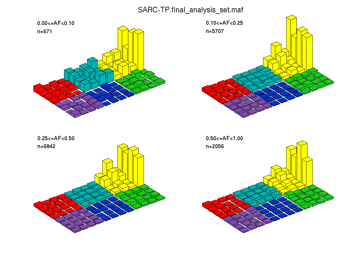 The mutation spectrum is depicted in the lego plots below in which the 96 possible mutation types are subdivided into six large blocks, color-coded to reflect the base substitution type. Each large block is further subdivided into the 16 possible pairs of 5' and 3' neighbors, as listed in the 4x4 trinucleotide context legend. The height of each block corresponds to the mutation frequency for that kind of mutation (counts of mutations normalized by the base coverage in a given bin). The shape of the spectrum is a signature for dominant mutational mechanisms in different tumor types.