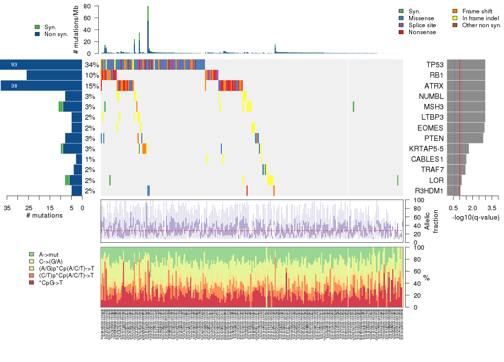 Figure 3. Get High-res Image The matrix in the center of the figure represents individual mutations in patient samples, color-coded by type of mutation, for the significantly mutated genes. The rate of synonymous and non-synonymous mutations is displayed at the top of the matrix. The barplot on the left of the matrix shows the number of mutations in each gene. The percentages represent the fraction of tumors with at least one mutation in the specified gene. The barplot to the right of the matrix displays the q-values for the most significantly mutated genes. The purple boxplots below the matrix (only displayed if required columns are present in the provided MAF) represent the distributions of allelic fractions observed in each sample. The plot at the bottom represents the base substitution distribution of individual samples, using the same categories that were used to calculate significance.