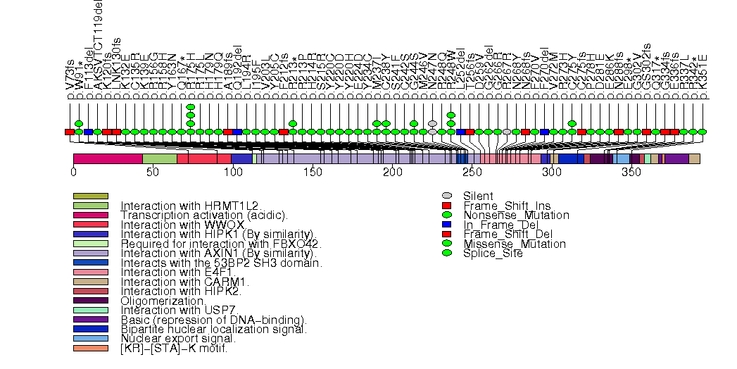 Figure S1. This figure depicts the distribution of mutations and mutation types across the TP53 significant gene.