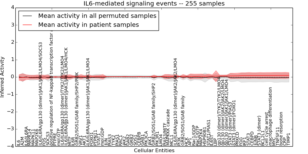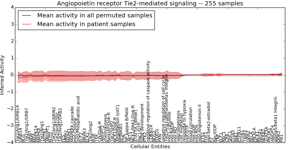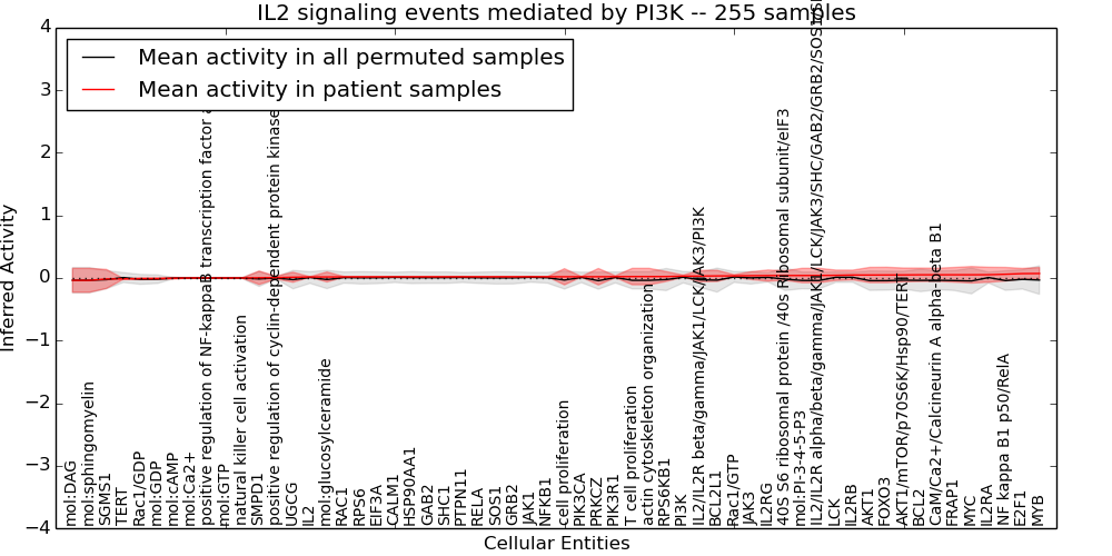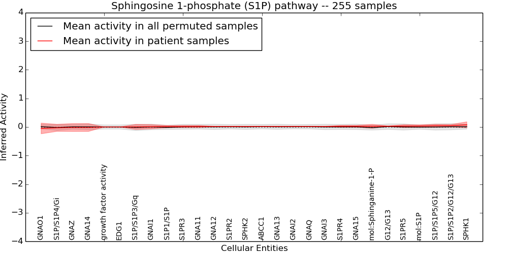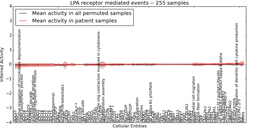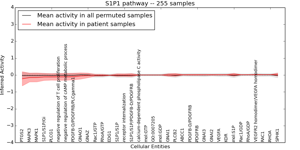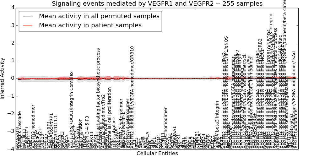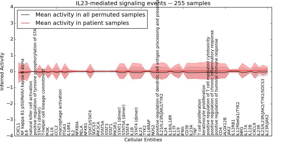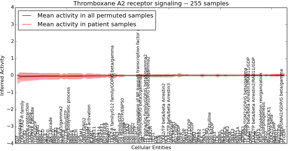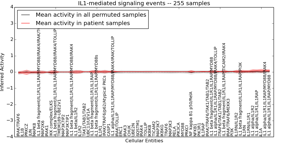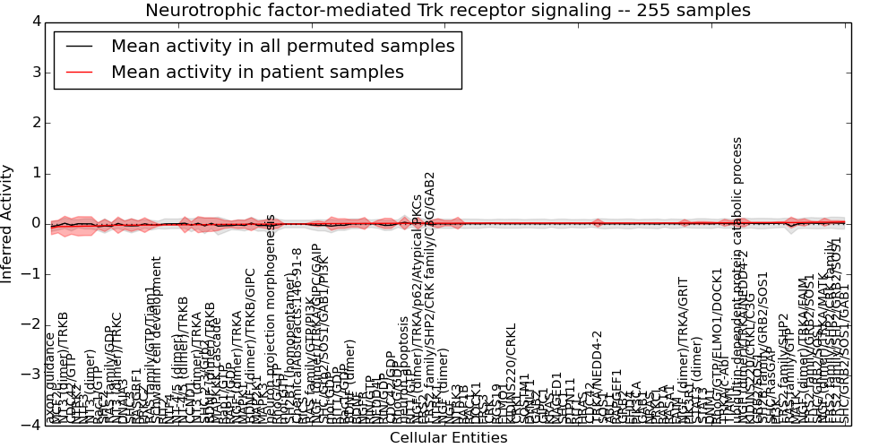 Figure S131. Get High-res Image This plot shows pathway concept perturbations across all samples against a permutation model. The concepts along the x-axis are sorted by lowest to highest mean activity for the real patient samples. Mean inferred activities are plotted along the y-axis as a colored band showing the average level and one standard deviation range. Real samples are shown in red and permuted samples in black.