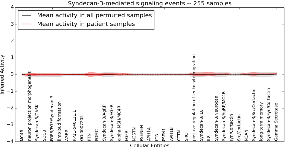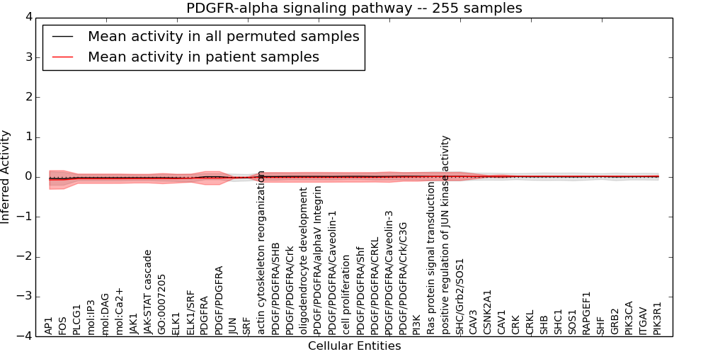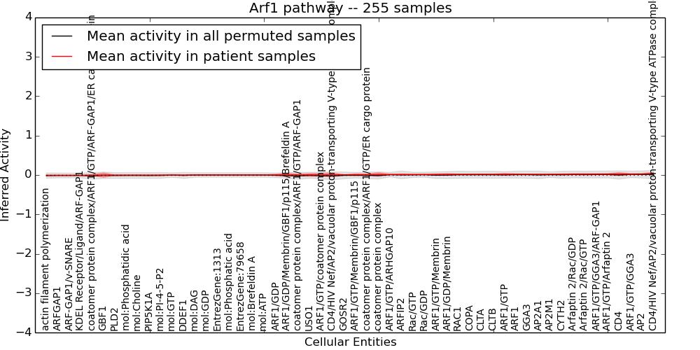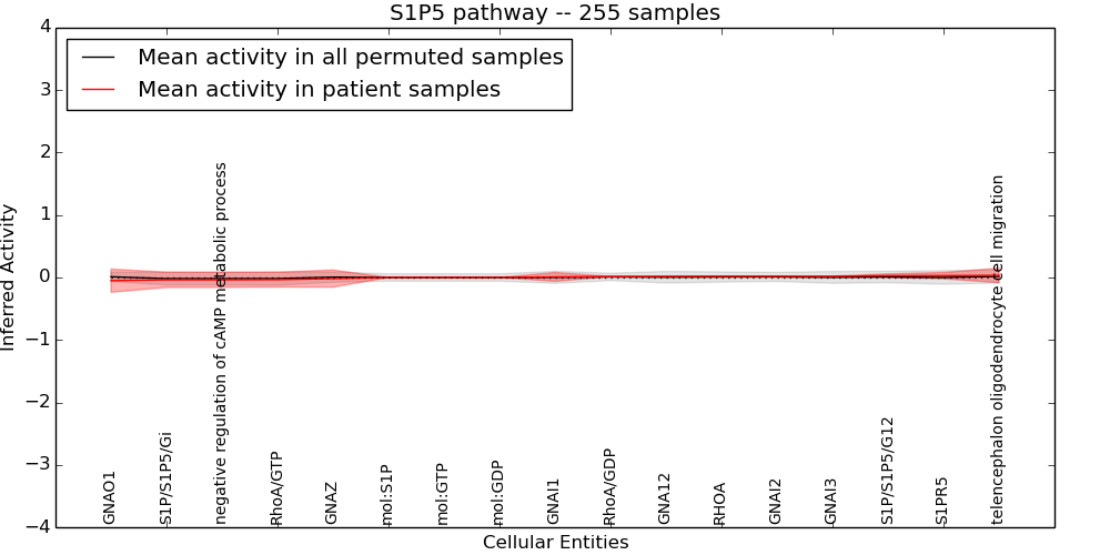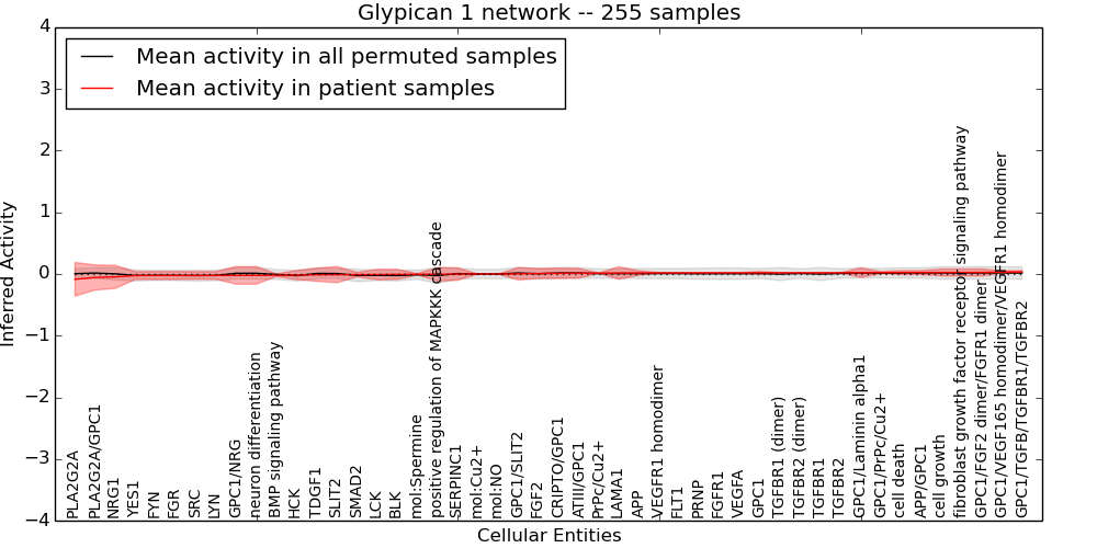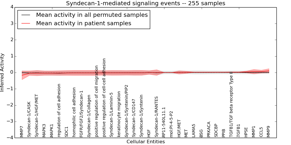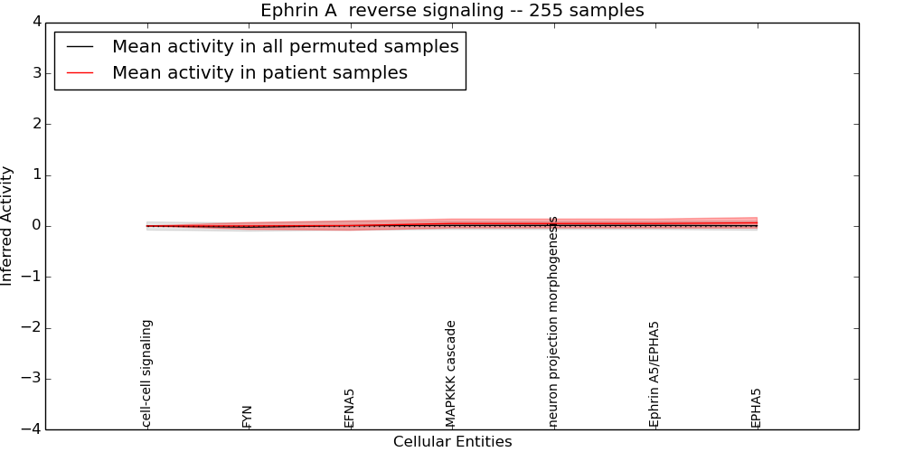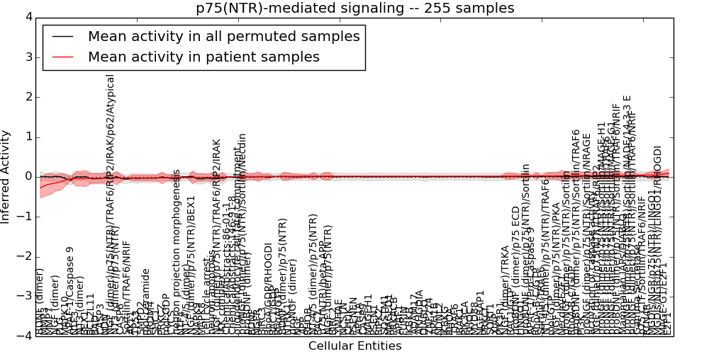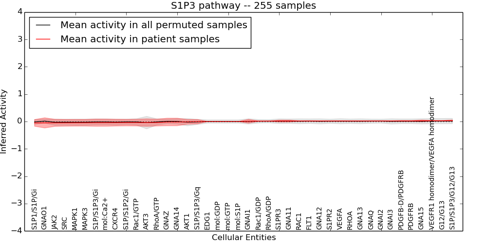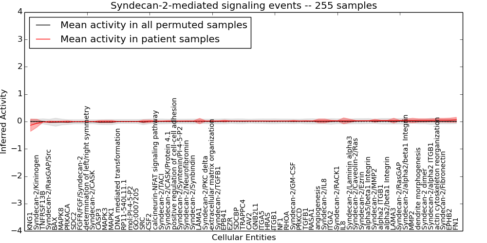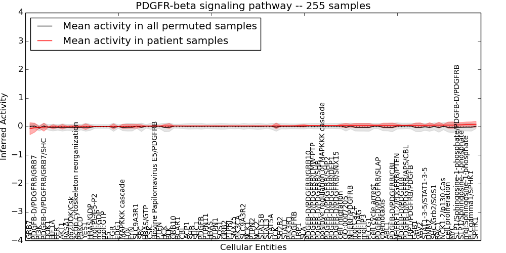 Figure S131. Get High-res Image This plot shows pathway concept perturbations across all samples against a permutation model. The concepts along the x-axis are sorted by lowest to highest mean activity for the real patient samples. Mean inferred activities are plotted along the y-axis as a colored band showing the average level and one standard deviation range. Real samples are shown in red and permuted samples in black.