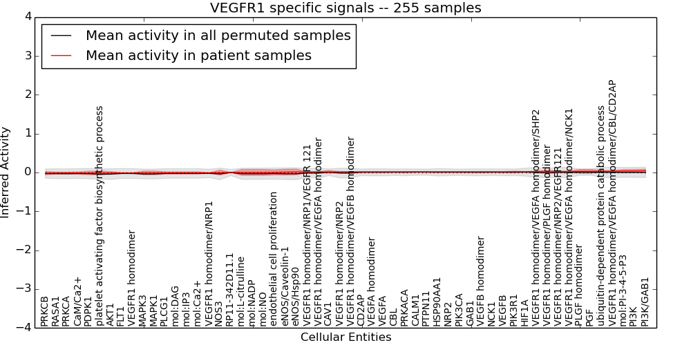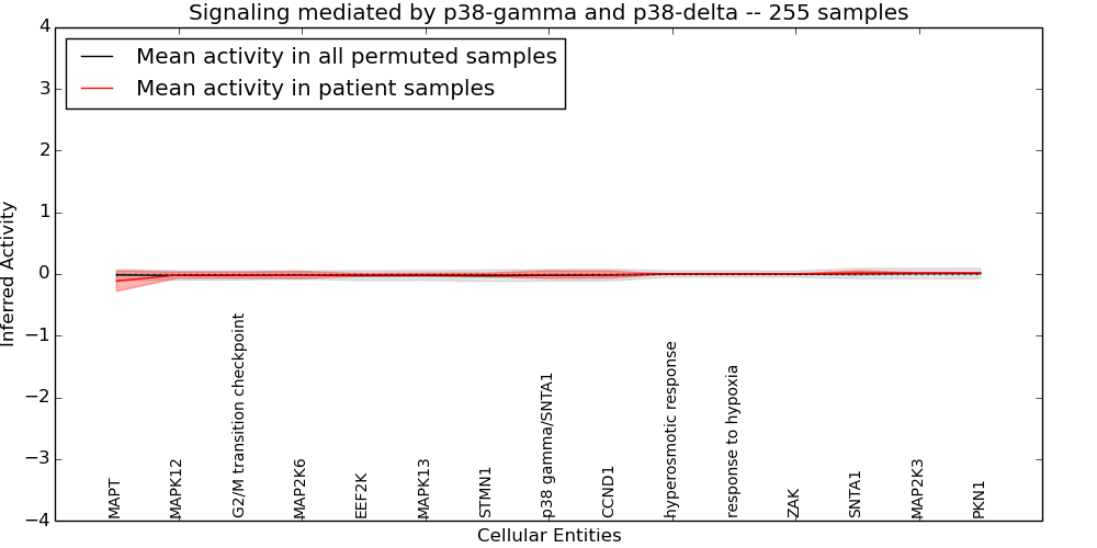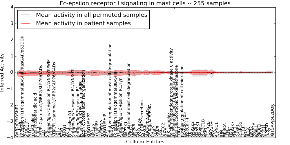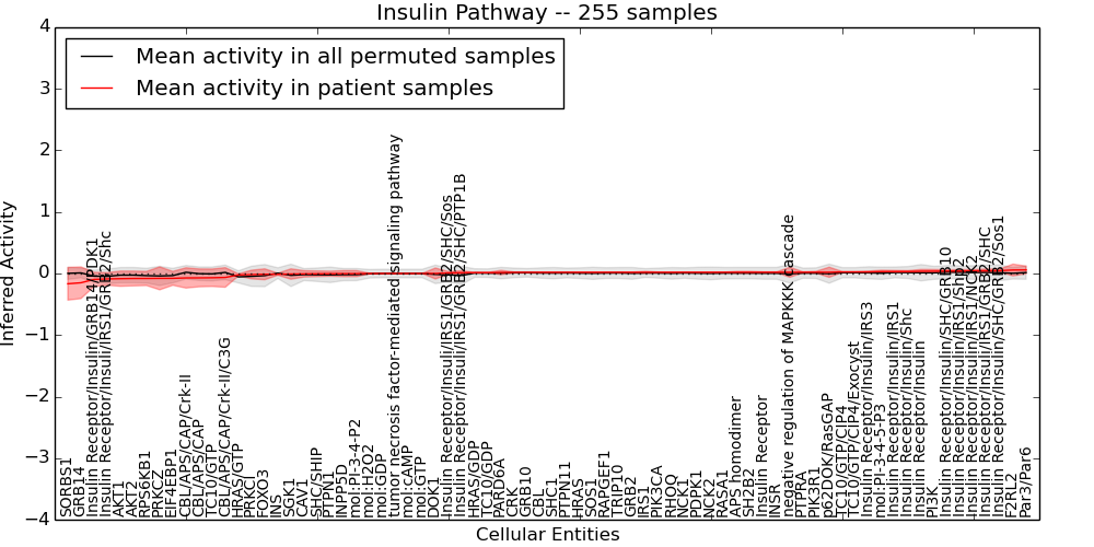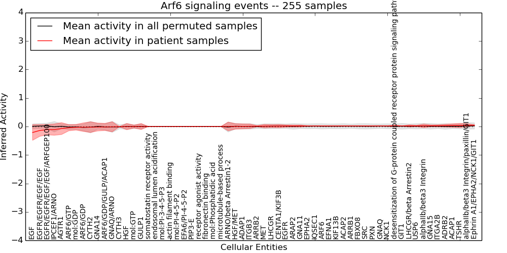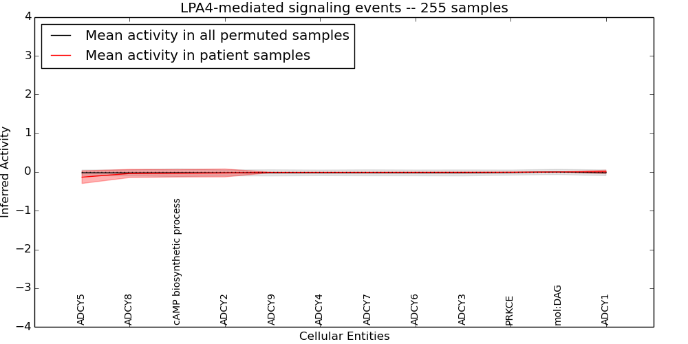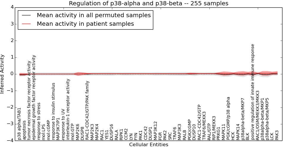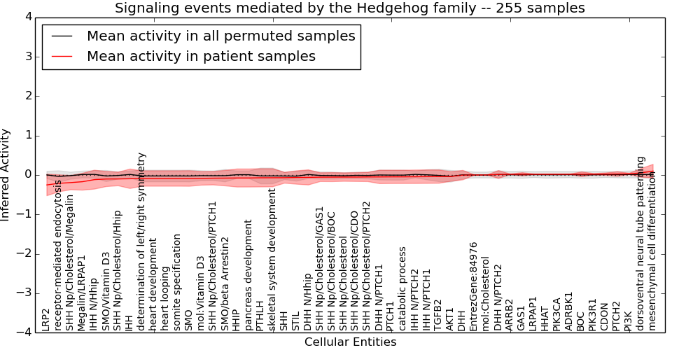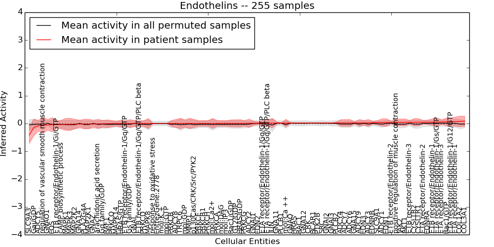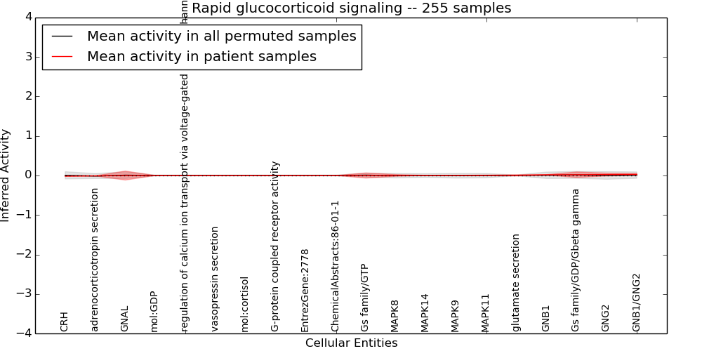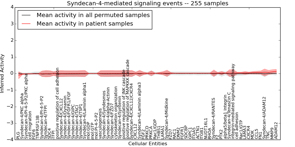 Figure S131. Get High-res Image This plot shows pathway concept perturbations across all samples against a permutation model. The concepts along the x-axis are sorted by lowest to highest mean activity for the real patient samples. Mean inferred activities are plotted along the y-axis as a colored band showing the average level and one standard deviation range. Real samples are shown in red and permuted samples in black.