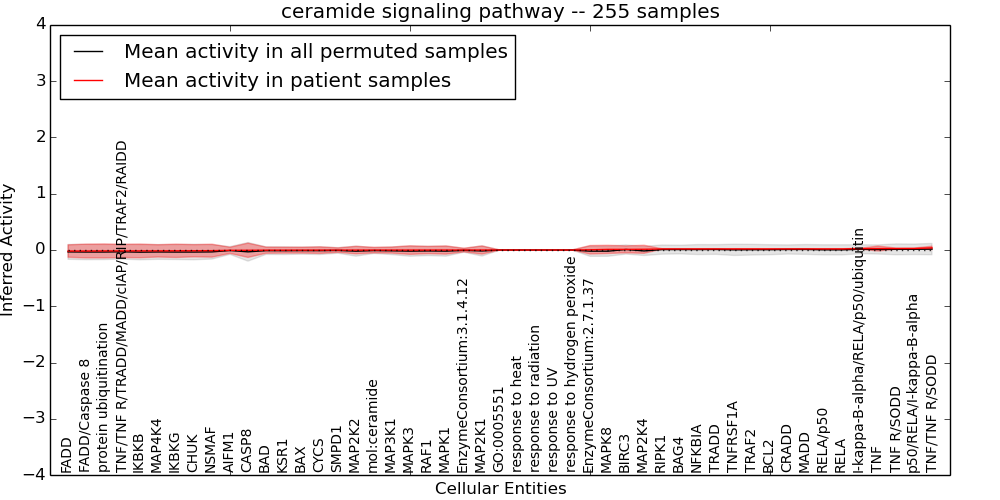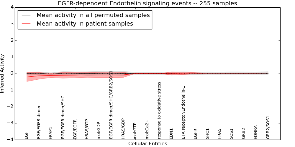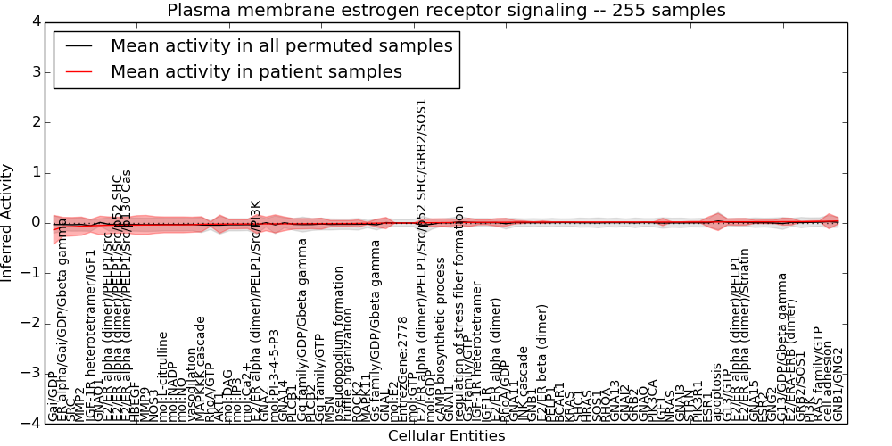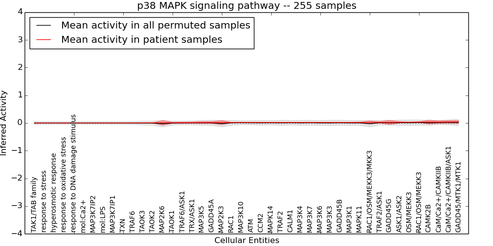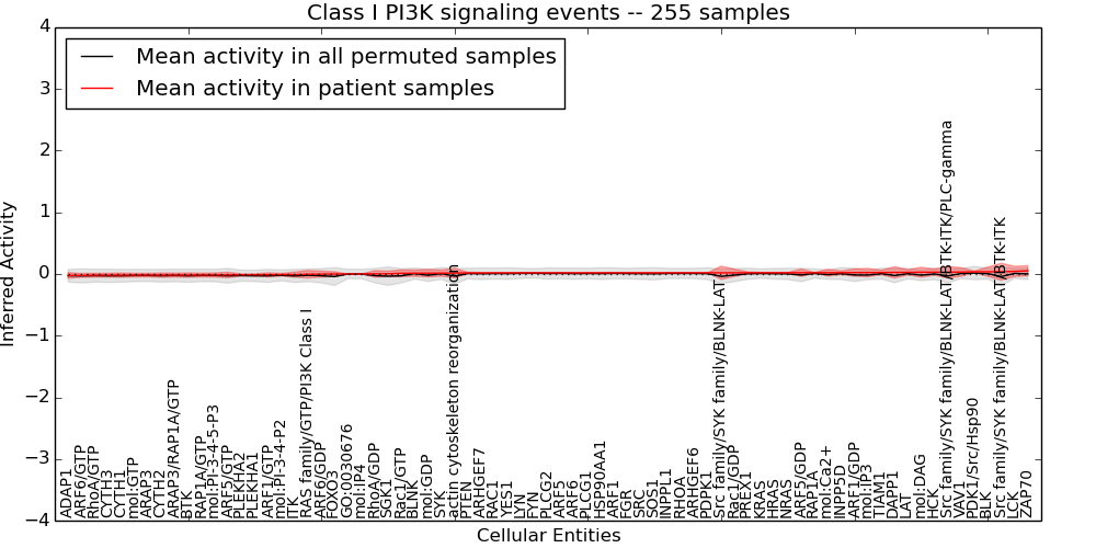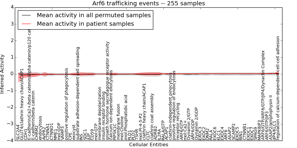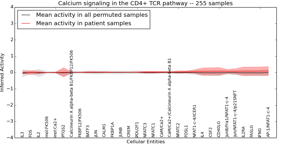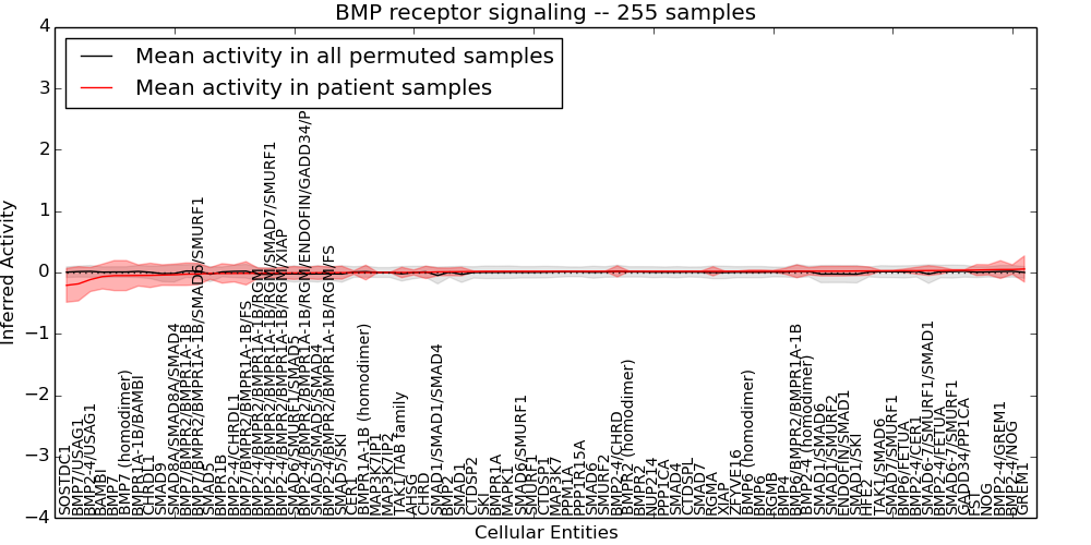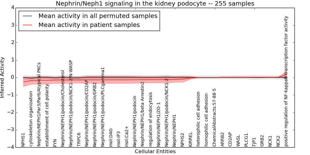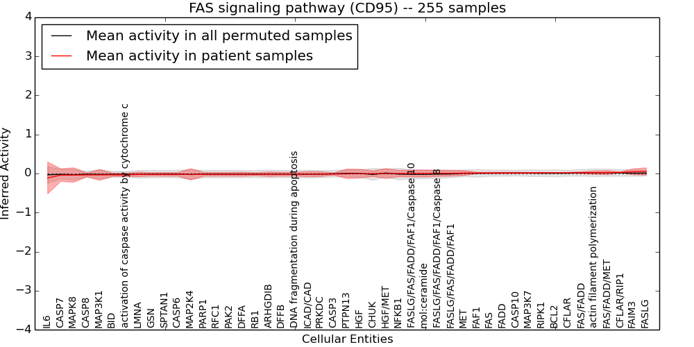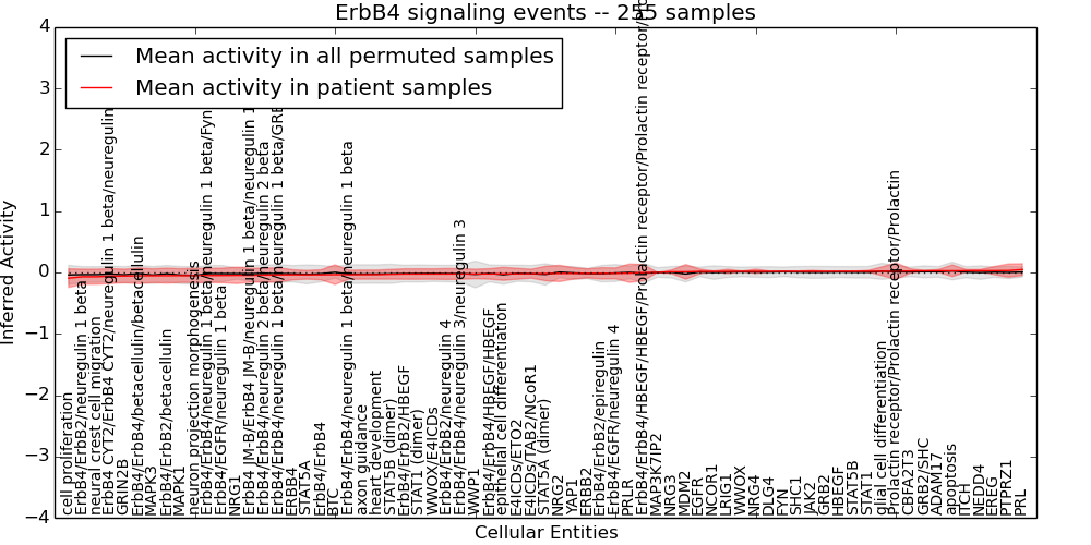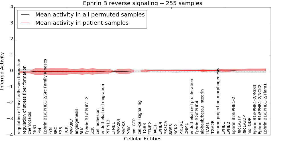 Figure S131. Get High-res Image This plot shows pathway concept perturbations across all samples against a permutation model. The concepts along the x-axis are sorted by lowest to highest mean activity for the real patient samples. Mean inferred activities are plotted along the y-axis as a colored band showing the average level and one standard deviation range. Real samples are shown in red and permuted samples in black.