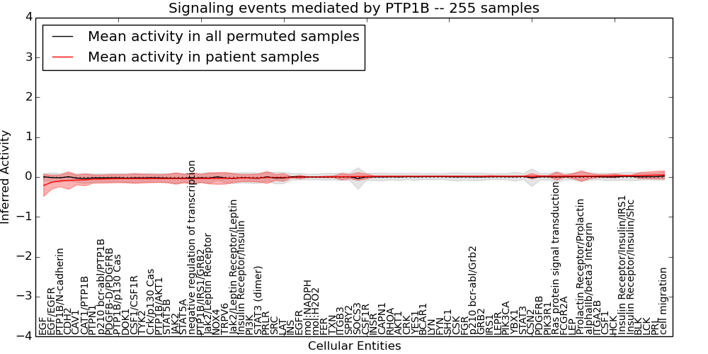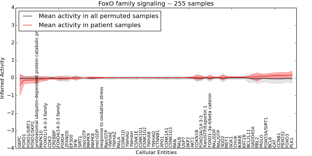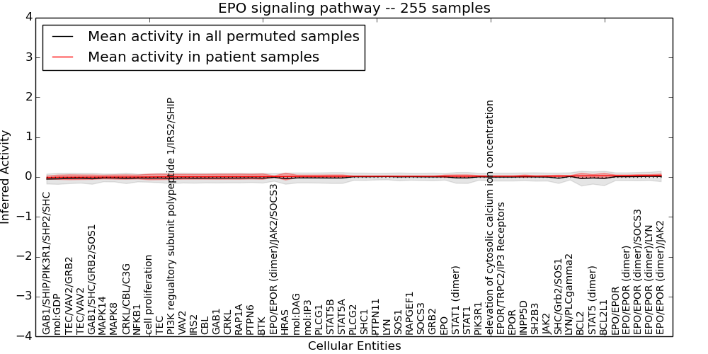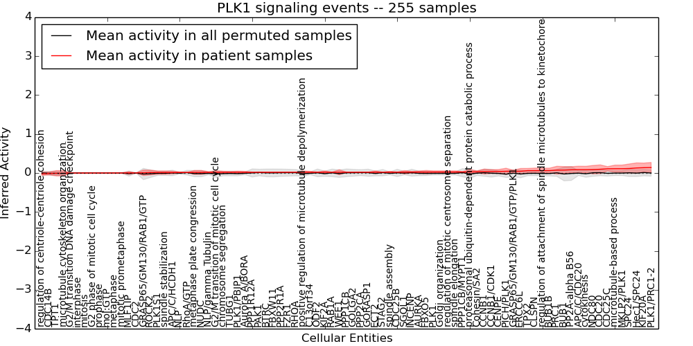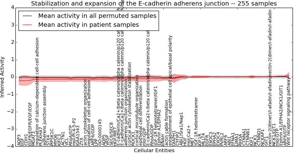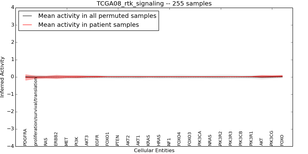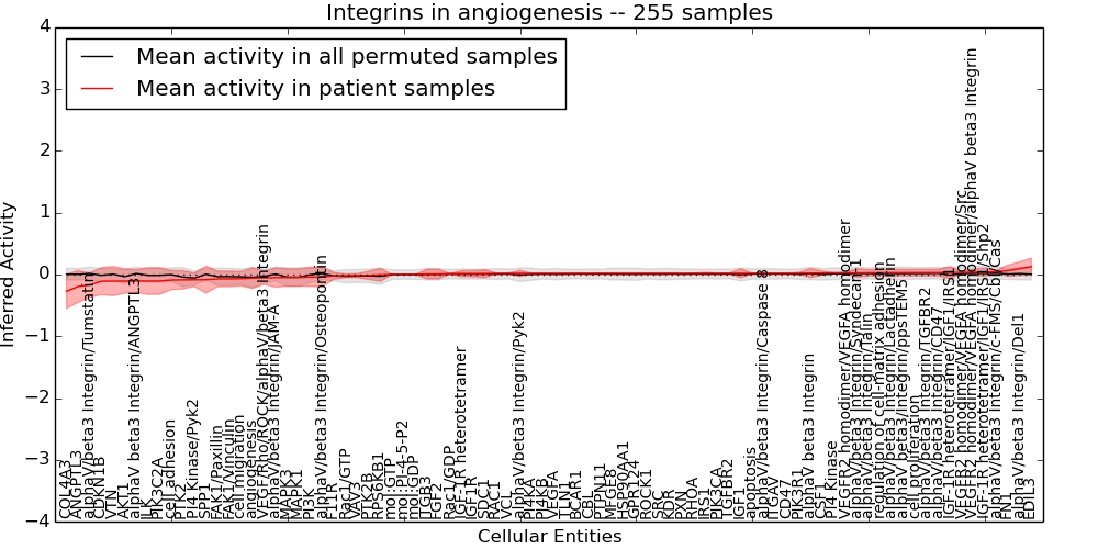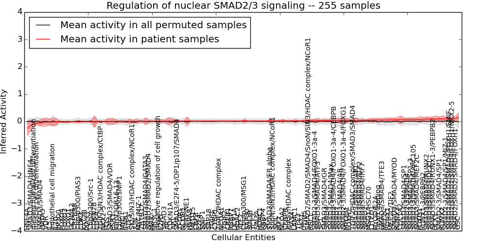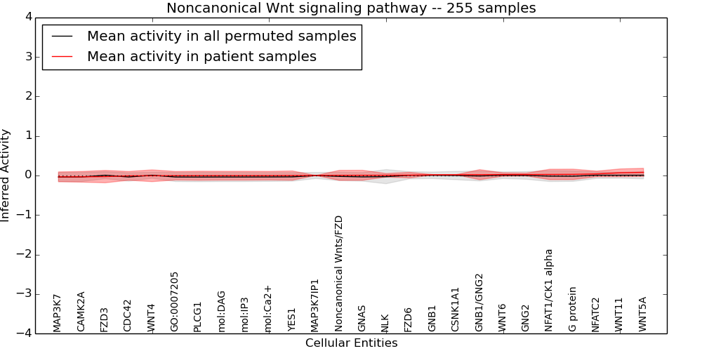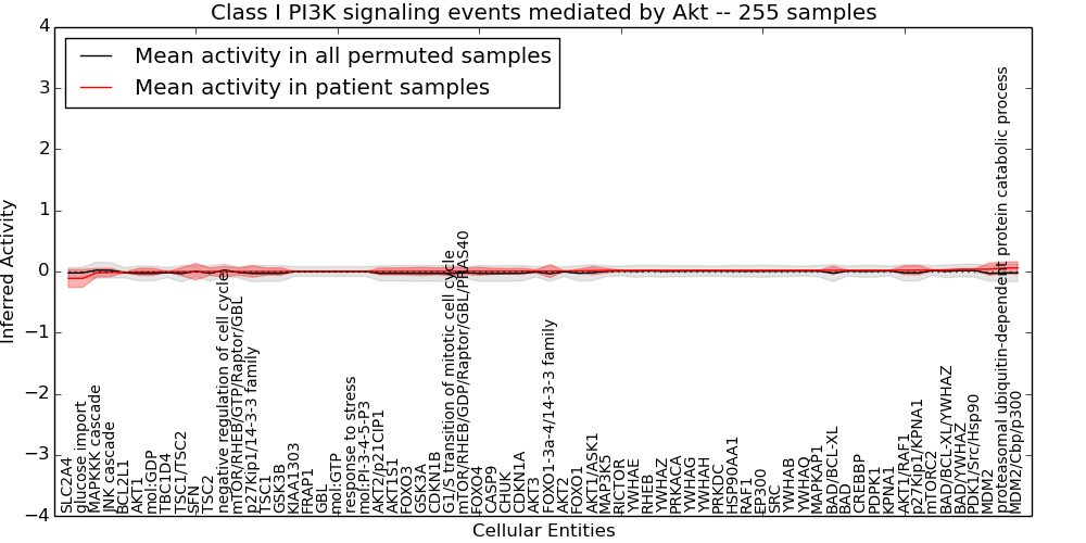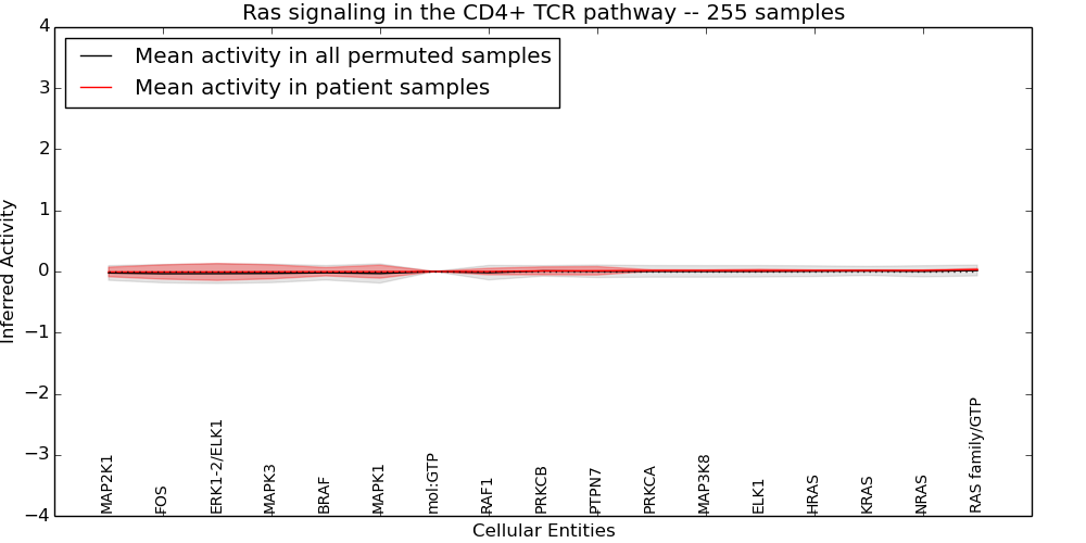 Figure S131. Get High-res Image This plot shows pathway concept perturbations across all samples against a permutation model. The concepts along the x-axis are sorted by lowest to highest mean activity for the real patient samples. Mean inferred activities are plotted along the y-axis as a colored band showing the average level and one standard deviation range. Real samples are shown in red and permuted samples in black.