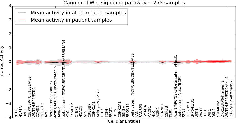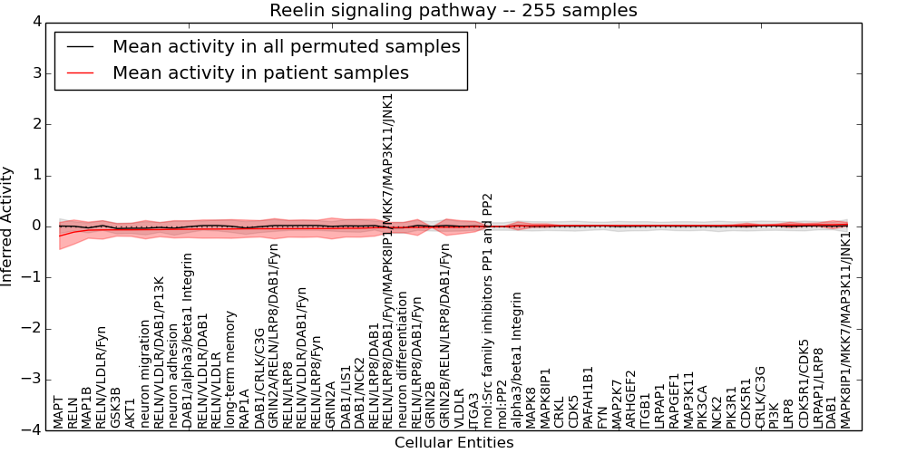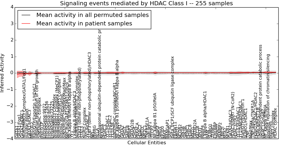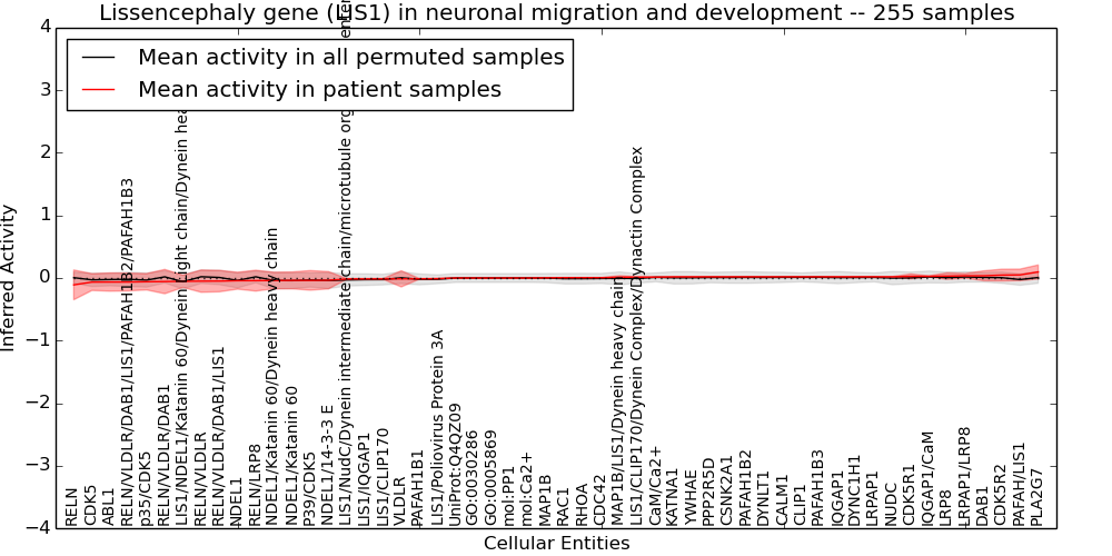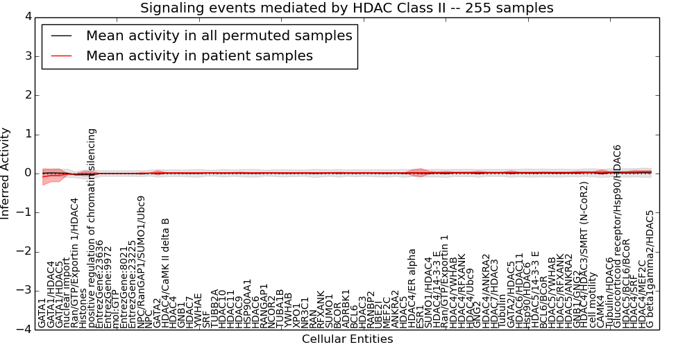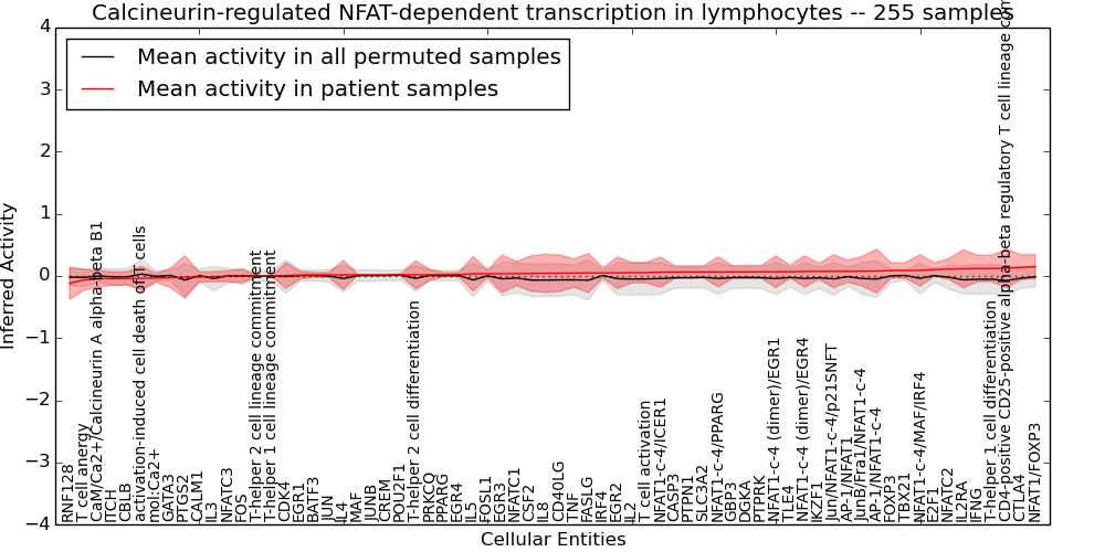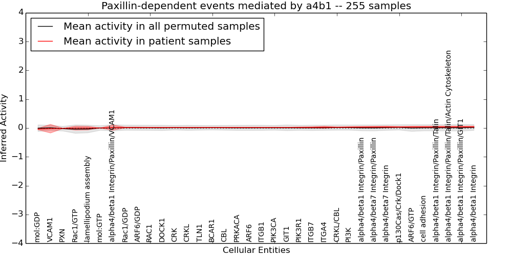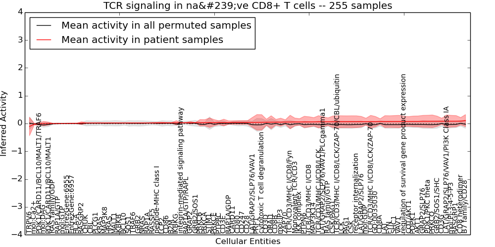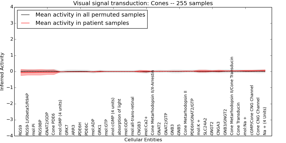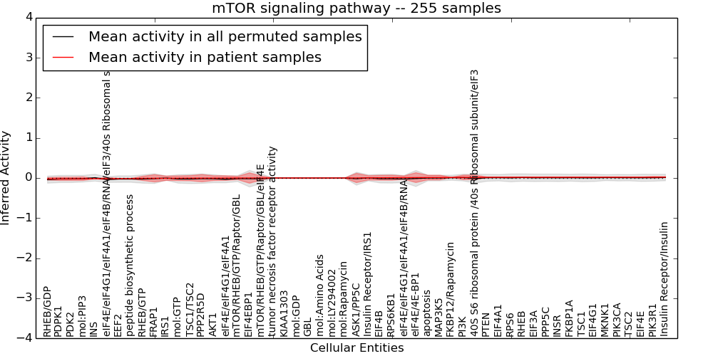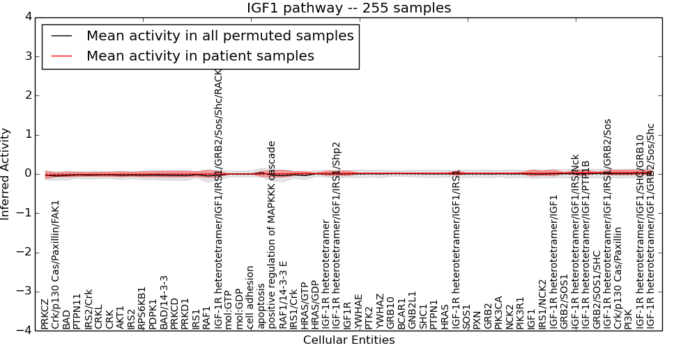 Figure S131. Get High-res Image This plot shows pathway concept perturbations across all samples against a permutation model. The concepts along the x-axis are sorted by lowest to highest mean activity for the real patient samples. Mean inferred activities are plotted along the y-axis as a colored band showing the average level and one standard deviation range. Real samples are shown in red and permuted samples in black.