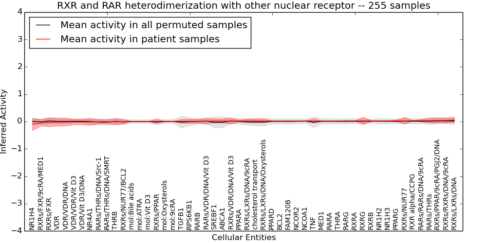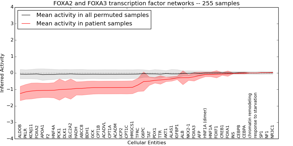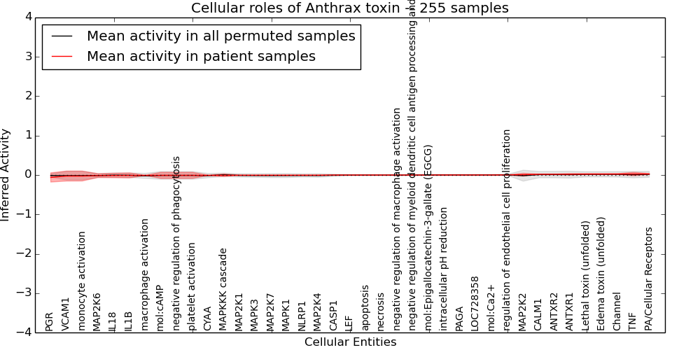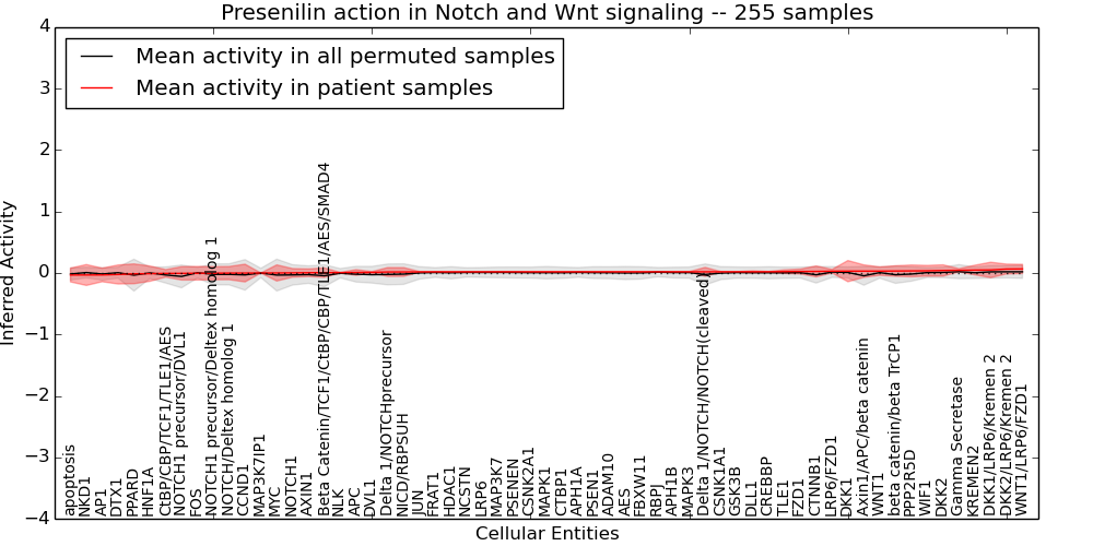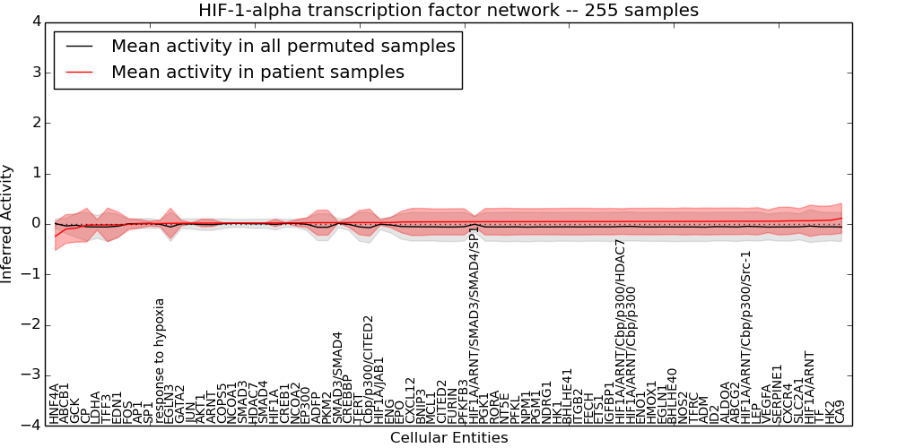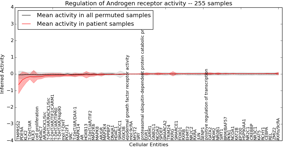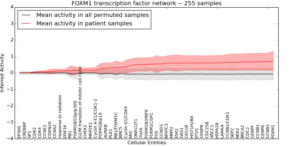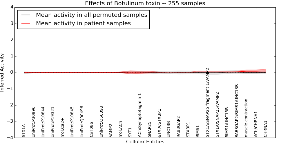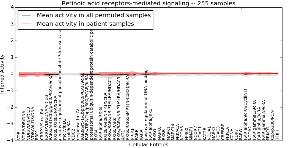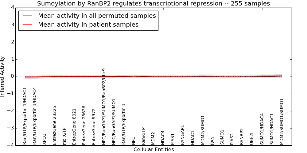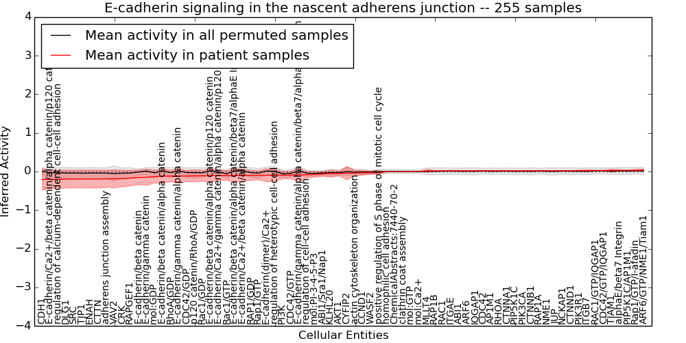 Figure S131. Get High-res Image This plot shows pathway concept perturbations across all samples against a permutation model. The concepts along the x-axis are sorted by lowest to highest mean activity for the real patient samples. Mean inferred activities are plotted along the y-axis as a colored band showing the average level and one standard deviation range. Real samples are shown in red and permuted samples in black.