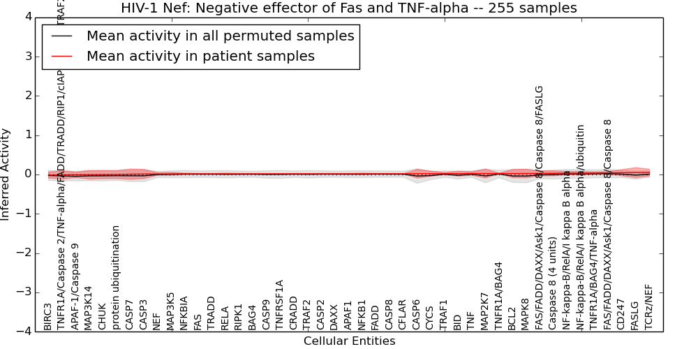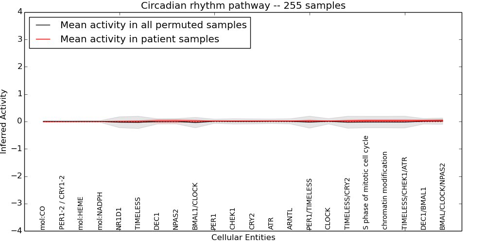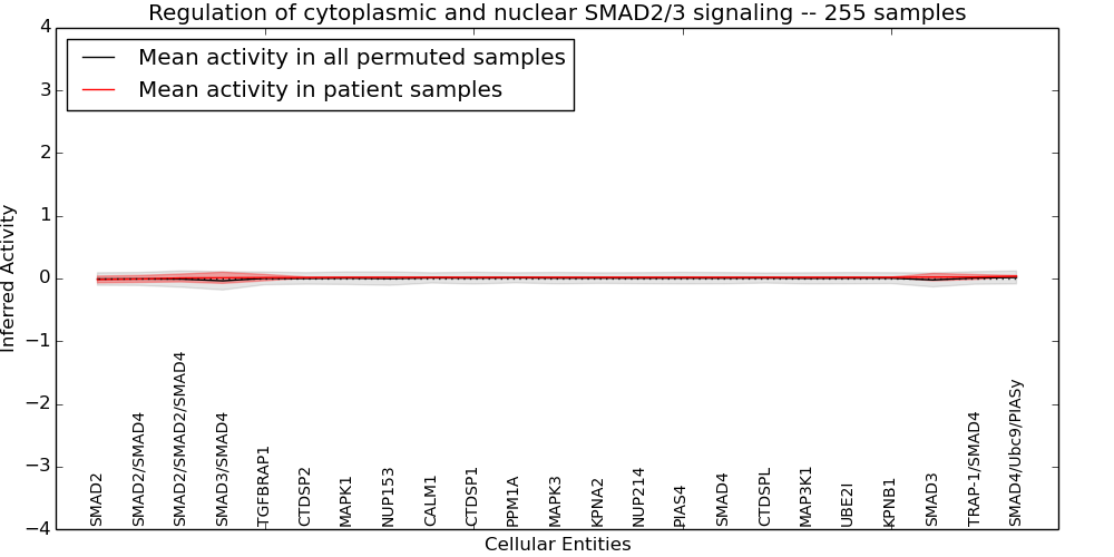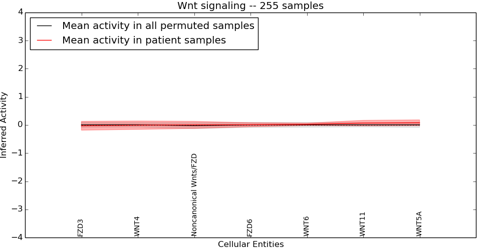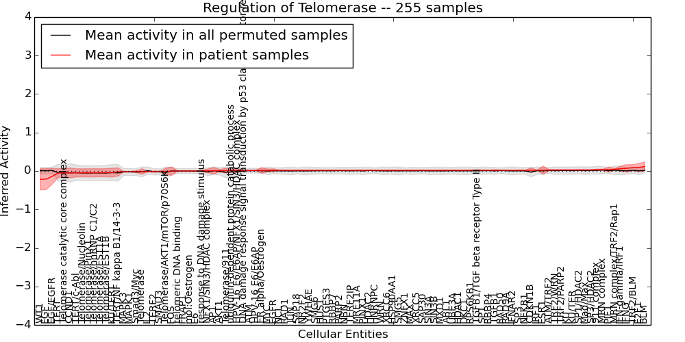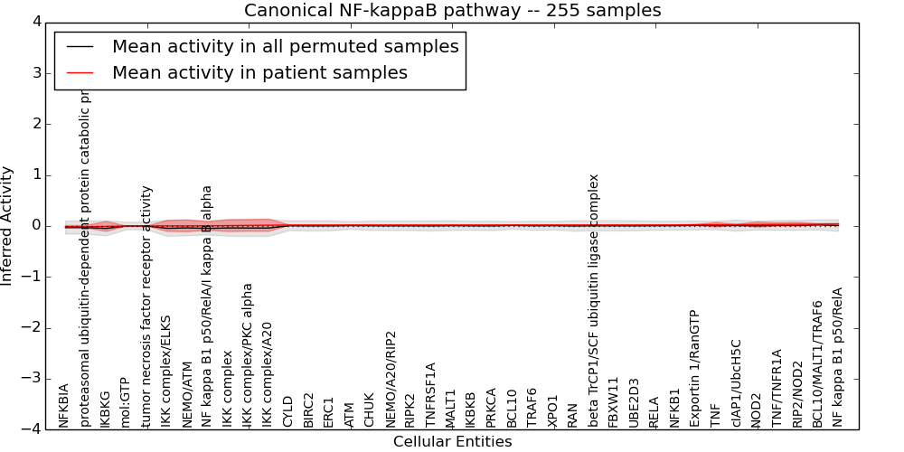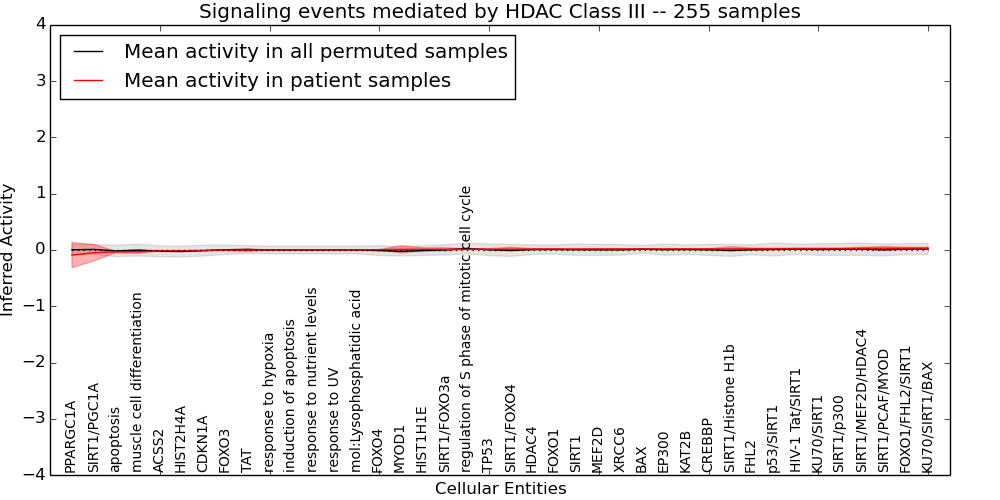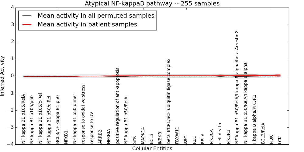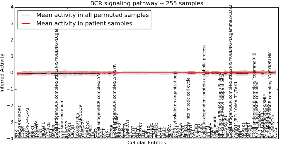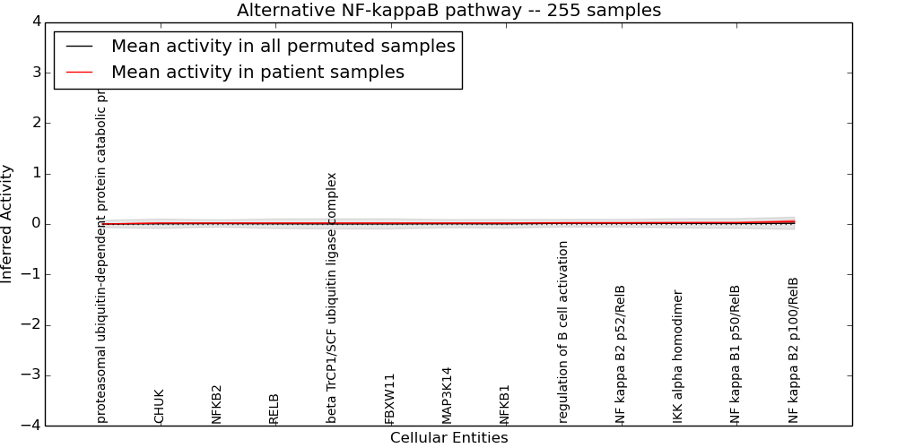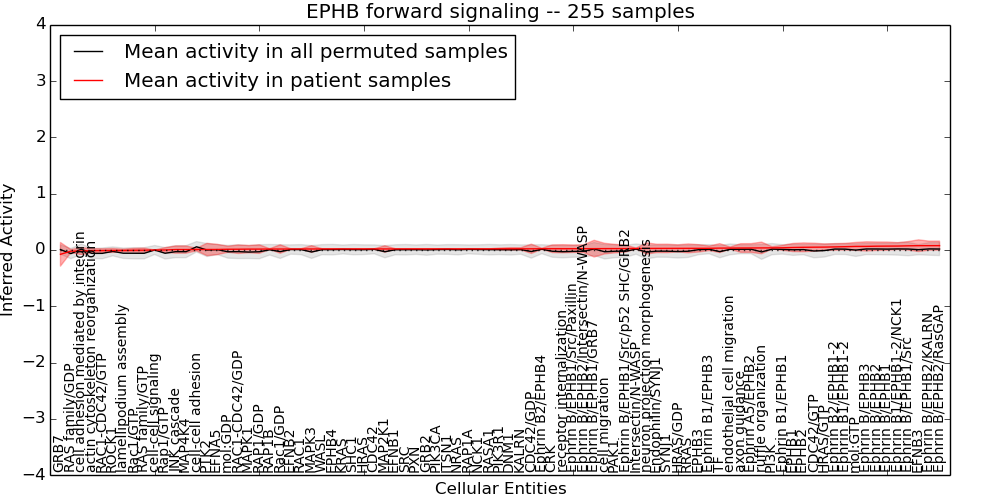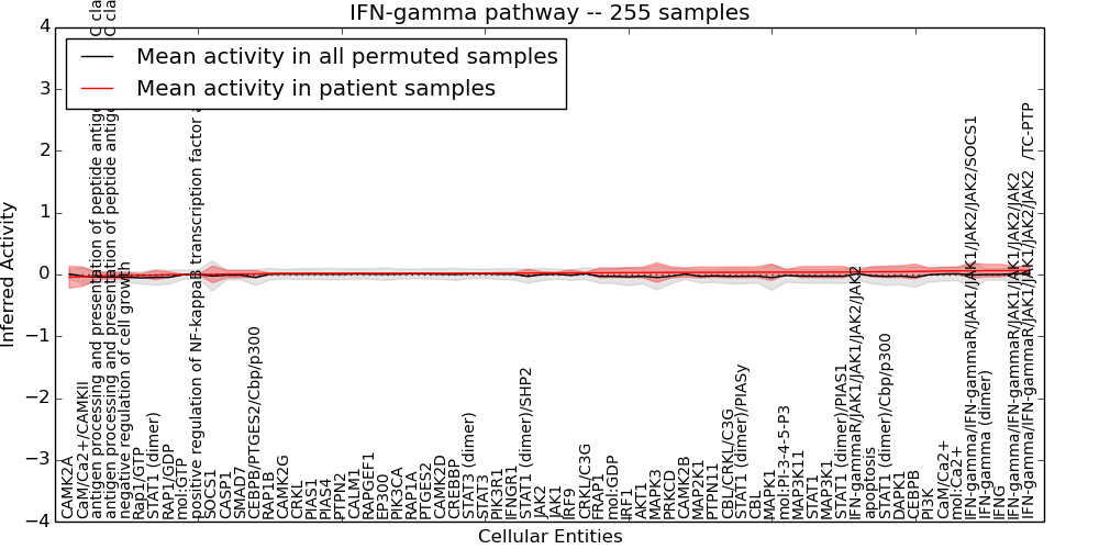 Figure S130. Get High-res Image This plot shows pathway concept perturbations across all samples against a permutation model. The concepts along the x-axis are sorted by lowest to highest mean activity for the real patient samples. Mean inferred activities are plotted along the y-axis as a colored band showing the average level and one standard deviation range. Real samples are shown in red and permuted samples in black.