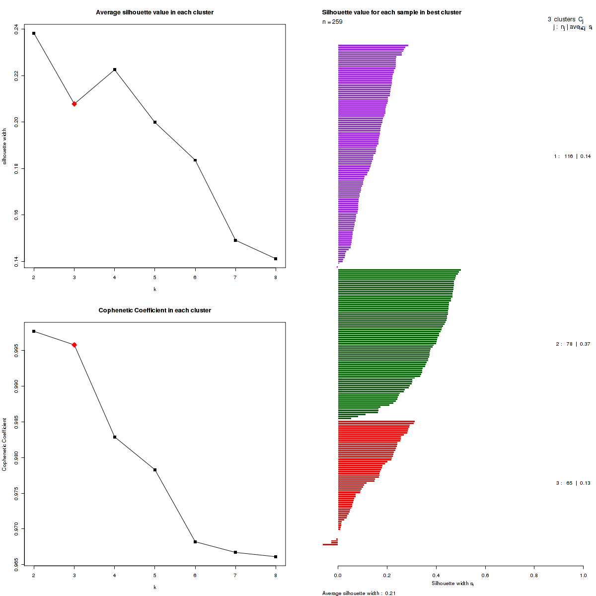 Figure 3. Get High-res Image The silhouette width was calculated for each sample and each value of k. The left upper panel shows the average silhouette width across all samples for each tested k (left upper panel). The left lower panel shows the Cophenetic Correlation Coefficients for each tested k. The right panel shows assignments of clusters to samples and the silhouette width of each sample for the most robust clustering.