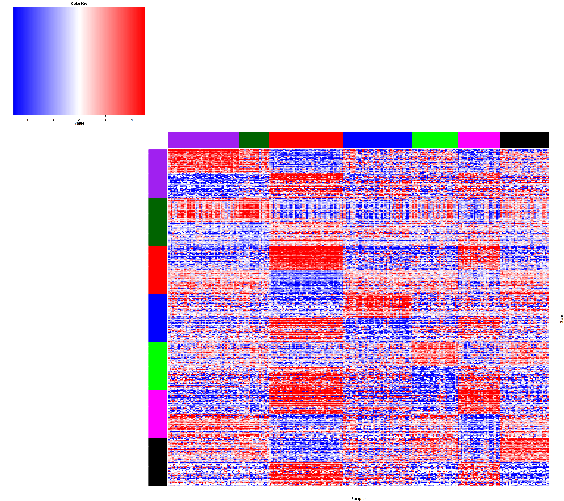 Figure 1. Get High-res Image Samples were separated into 7 clusters. Shown are 259 samples and 2100 marker genes. The color bar of the row indicates the marker genes for the corresponding cluster.