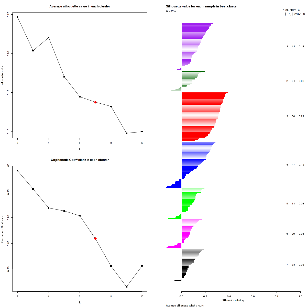 The cophenetic correlation coefficients and average silhouette values are used to determine the k with the most robust clusterings. From the plot of cophenetic correlation versus k, we select modes and the the point preceding the greatest decrease in cophenetic correlation coefficient, and from these choose the k with the highest average silhouette value.