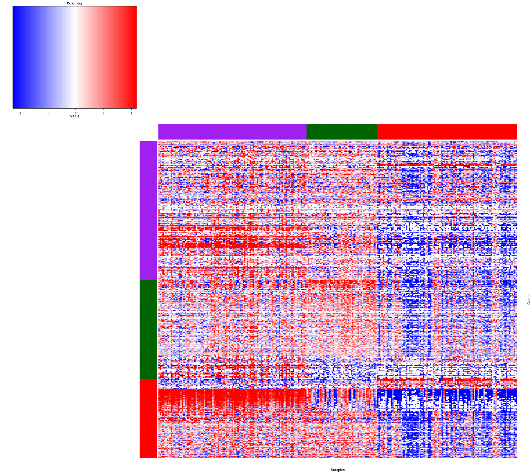 Figure 1.  Get High-res Image Samples were separated into 3 clusters. Shown are 259 samples and 693 marker miRs. The color bar of the row indicates the marker miRs for the corresponding cluster.