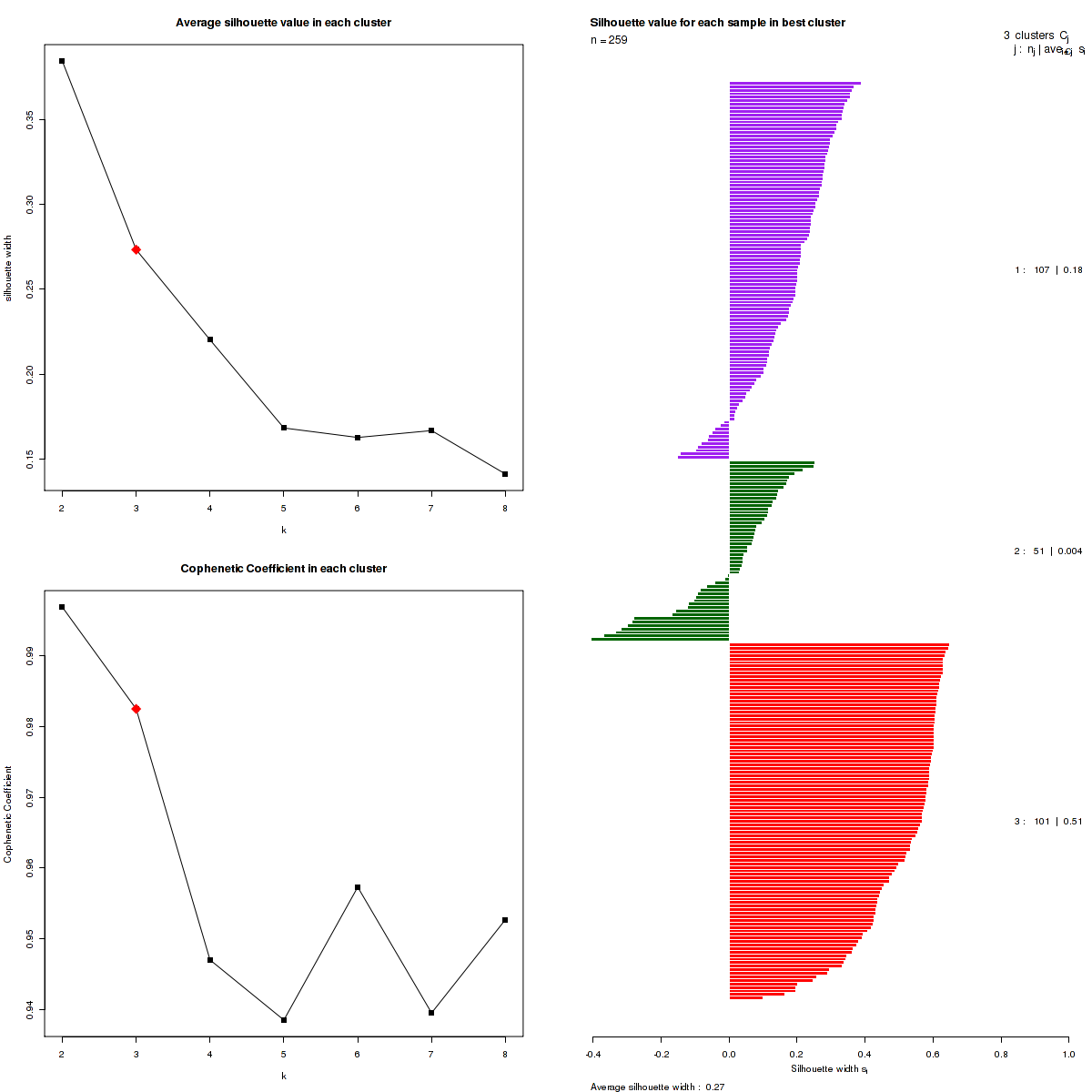 Figure 3.  Get High-res Image The silhouette width was calculated for each sample and each value of k. The left upper panel shows the average silhouette width across all samples for each tested k (left upper panel). The left lower panel shows the Cophenetic Correlation Coefficients for each tested k. The right panel shows assignments of clusters to samples and the silhouette width of each sample for the most robust clustering.