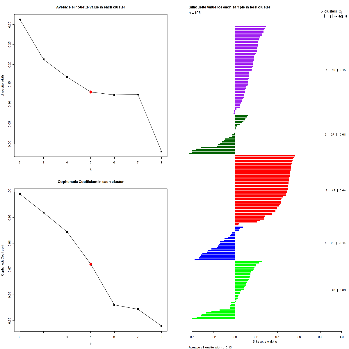 The most robust consensus NMF clustering of 198 samples using the 647 most variable miRs was identified for k = 5 clusters. We computed the clustering for k = 2 to k = 10 and uused the cophenetic correlation coefficient and the average silhouette width calculation to determine the robust clusters.