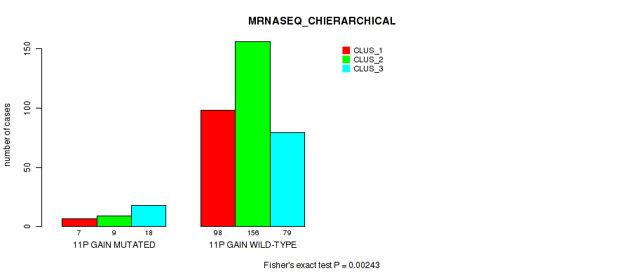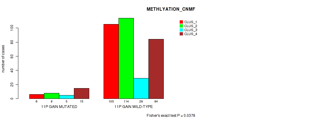11p gain cnv correlated to 'METHLYATION_CNMF', 'RPPA_CHIERARCHICAL', 'MRNASEQ_CNMF', 'MRNASEQ_CHIERARCHICAL', and 'MIRSEQ_CHIERARCHICAL'.