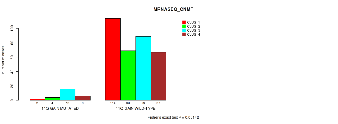 11q gain cnv correlated to 'RPPA_CHIERARCHICAL', 'MRNASEQ_CNMF', 'MRNASEQ_CHIERARCHICAL', and 'MIRSEQ_CHIERARCHICAL'.