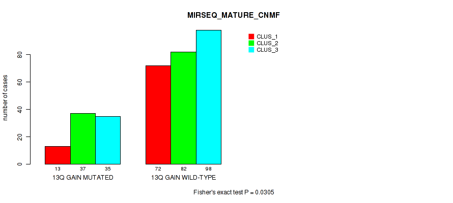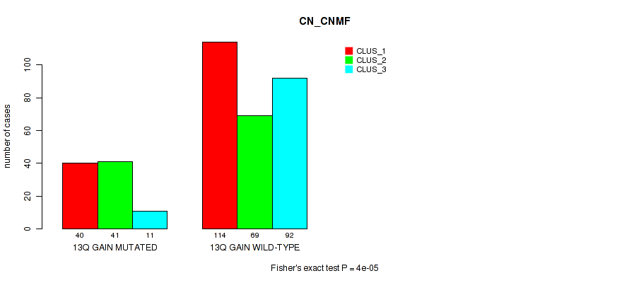 13q gain cnv correlated to 'CN_CNMF', 'METHLYATION_CNMF', 'MRNASEQ_CNMF', 'MIRSEQ_MATURE_CNMF', and 'MIRSEQ_MATURE_CHIERARCHICAL'.