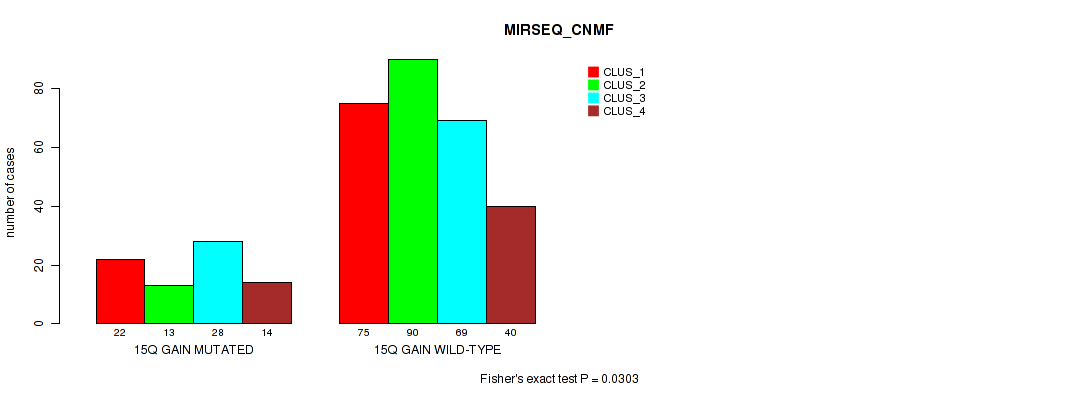 15q gain cnv correlated to 'CN_CNMF', 'MRNASEQ_CNMF', 'MRNASEQ_CHIERARCHICAL', 'MIRSEQ_CNMF', and 'MIRSEQ_MATURE_CHIERARCHICAL'.