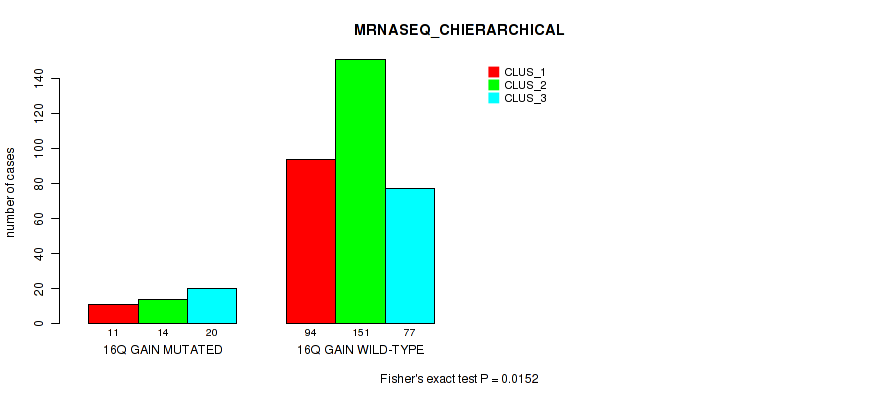 16q gain cnv correlated to 'CN_CNMF', 'METHLYATION_CNMF', 'MRNASEQ_CNMF', 'MRNASEQ_CHIERARCHICAL', and 'MIRSEQ_MATURE_CHIERARCHICAL'.