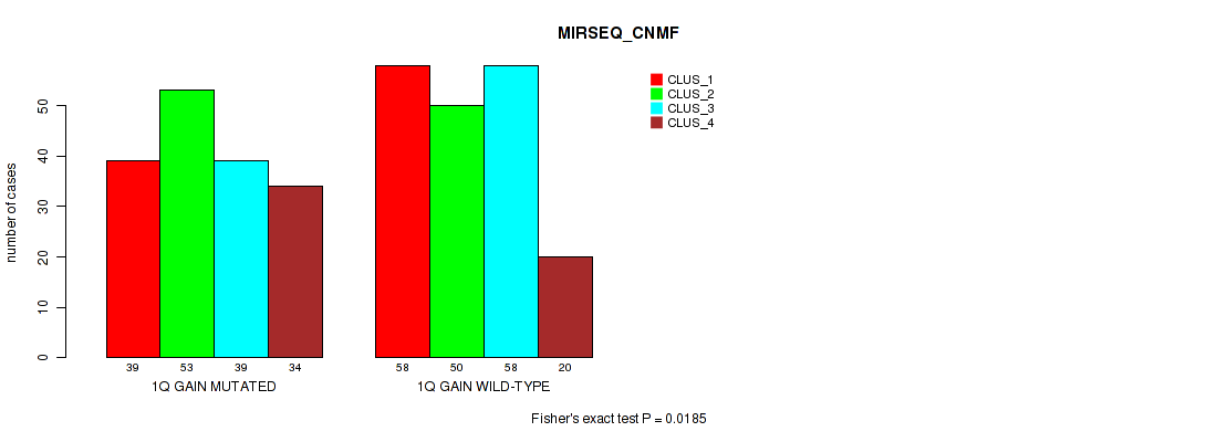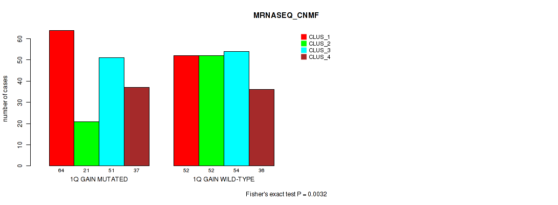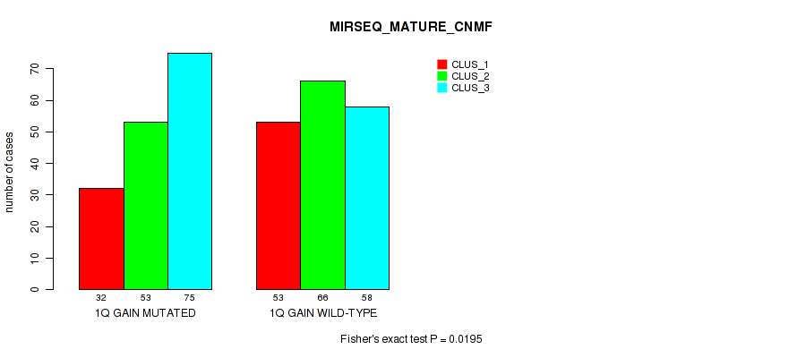 1q gain cnv correlated to 'CN_CNMF', 'RPPA_CNMF', 'MRNASEQ_CNMF', 'MIRSEQ_CNMF', and 'MIRSEQ_MATURE_CNMF'.