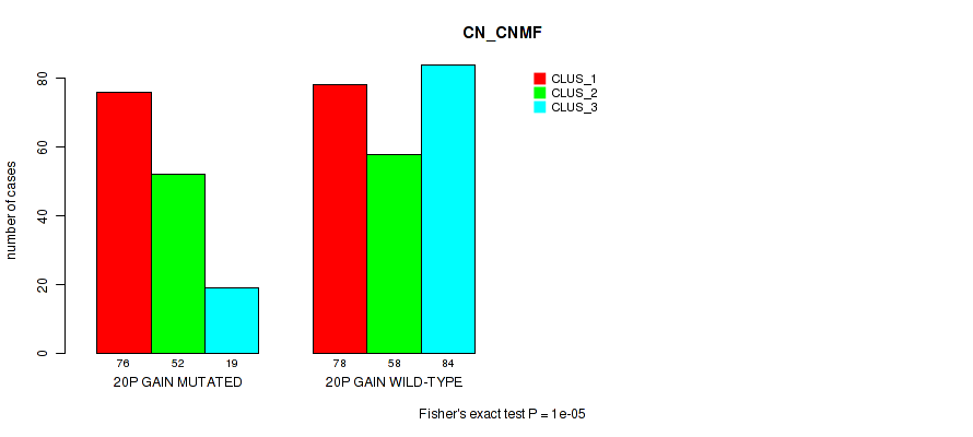 20p gain cnv correlated to 'CN_CNMF', 'METHLYATION_CNMF', 'MRNASEQ_CNMF', and 'MRNASEQ_CHIERARCHICAL'.