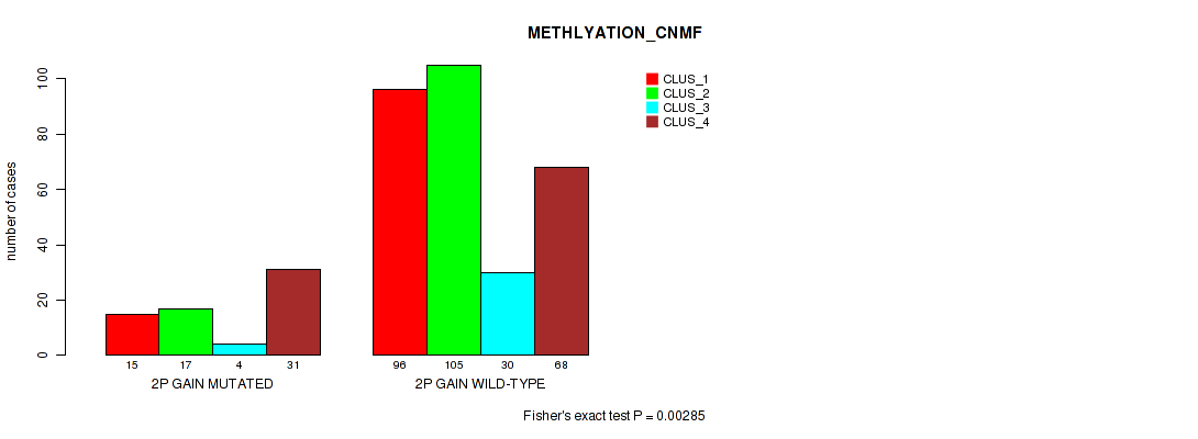 2p gain cnv correlated to 'CN_CNMF', 'METHLYATION_CNMF', 'MRNASEQ_CNMF', 'MRNASEQ_CHIERARCHICAL', 'MIRSEQ_CHIERARCHICAL', and 'MIRSEQ_MATURE_CHIERARCHICAL'.