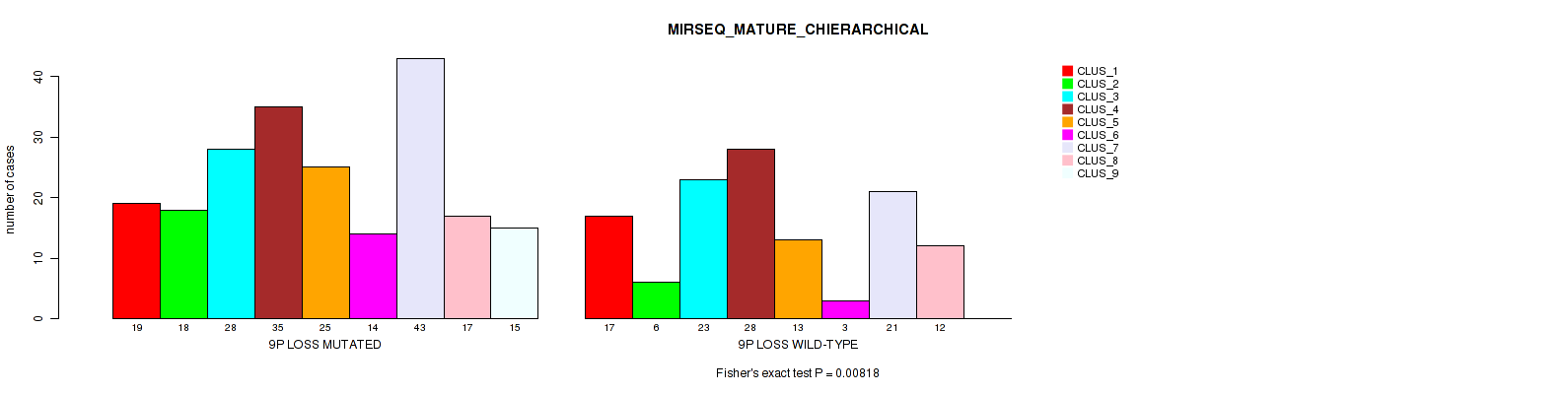 9p loss cnv correlated to 'CN_CNMF', 'METHLYATION_CNMF', 'RPPA_CNMF', 'MRNASEQ_CHIERARCHICAL', and 'MIRSEQ_MATURE_CHIERARCHICAL'.