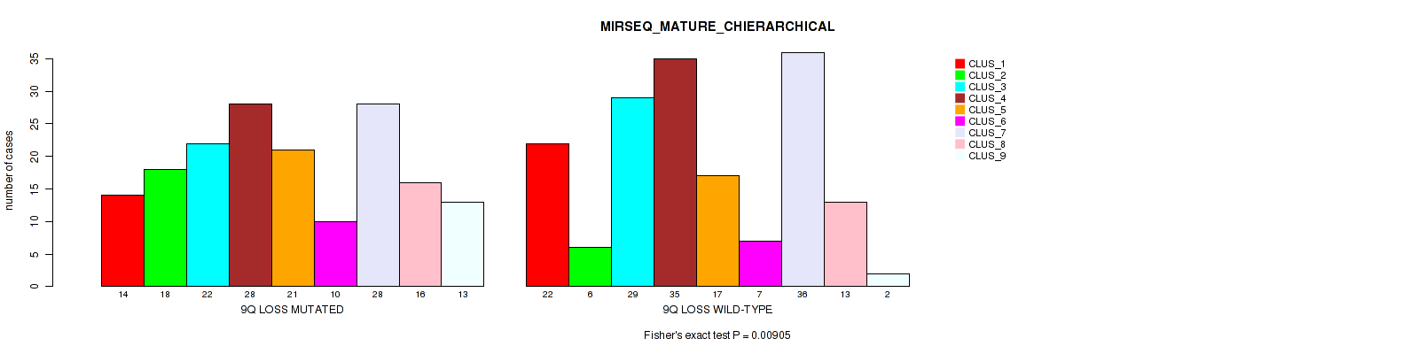 9q loss cnv correlated to 'CN_CNMF', 'MIRSEQ_CHIERARCHICAL', and 'MIRSEQ_MATURE_CHIERARCHICAL'.