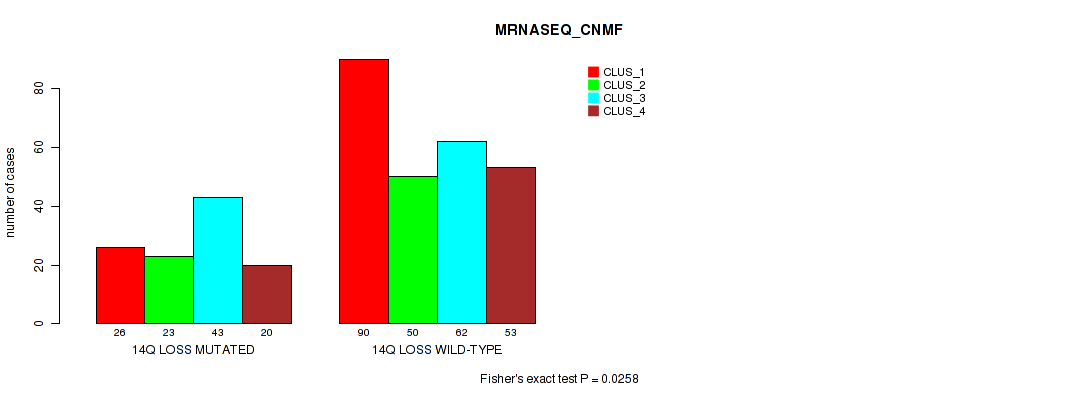 14q loss cnv correlated to 'CN_CNMF', 'RPPA_CHIERARCHICAL', and 'MRNASEQ_CNMF'.