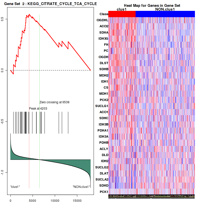 Figure S1.  Get High-res Image This plot shows mRNAseq_cNMF expression data heatmap (on the left) a RunningEnrichmentScore(RES) plot (on the top right) and a Signal2Noise(S2N) plot (on the bottom right) of genes in the pathway: KEGG CITRATE CYCLE TCA CYCLE.