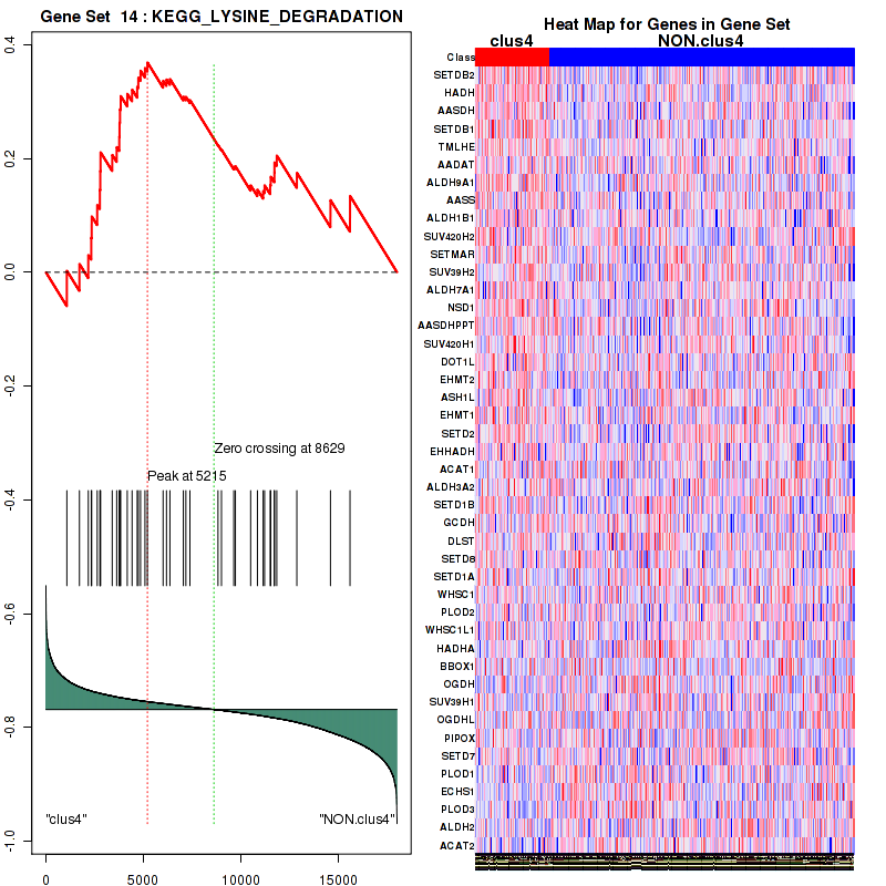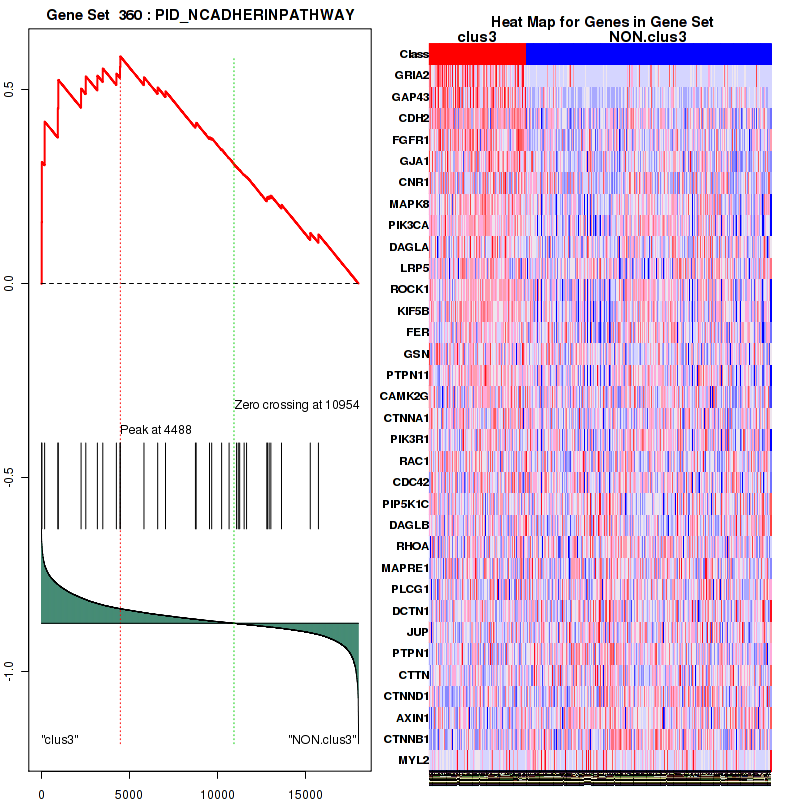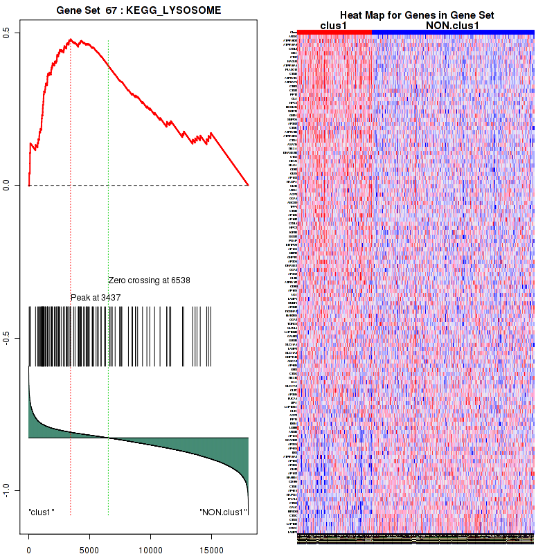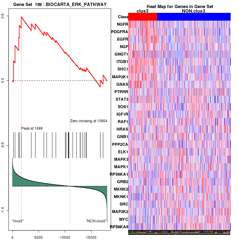 Table S1.  Get Full Table This table shows a Running Enrichment Score (RES) of each gene in this pathway, that is, the enrichment score at this point in the ranked list of genes. All genes are ranked by Signal-to-Noise (S2N), a measure of similarity as default and are used to obtain ES matrix of all genes. In this way, GSEA tool uses expression pattern of not only overlapped genes but also not-overlapped genes to produce ES matrix.