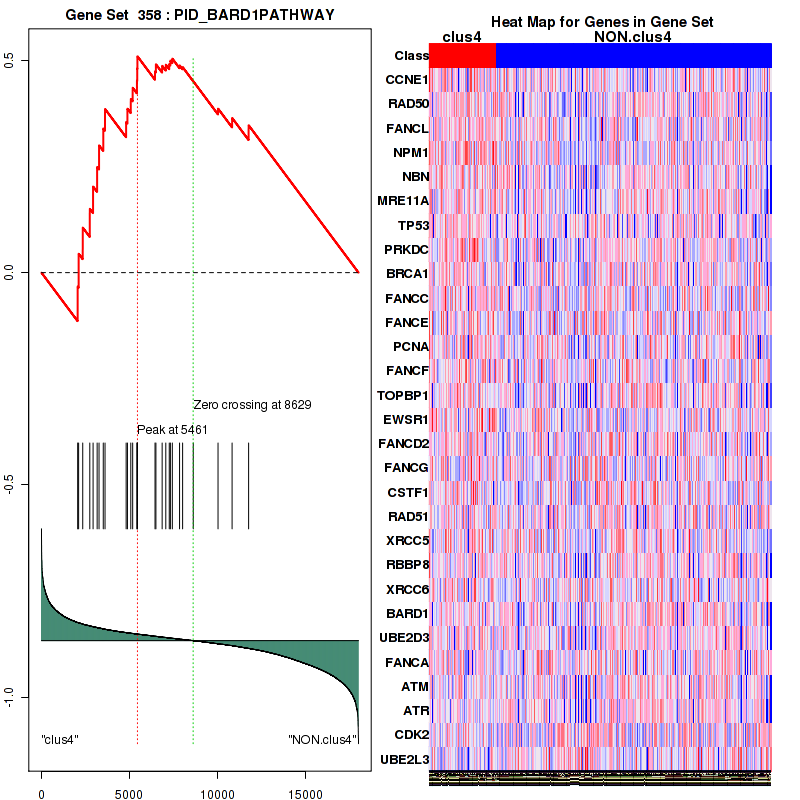 Table 3.  Get Full Table This table shows top 10 pathways which are significantly enriched in cluster clus1. It displays only significant gene sets satisfying nom.p.val.threshold (-1), fwer.p.val.threshold (-1) , fdr.q.val.threshold (0.25) and the default table is sorted by Normalized Enrichment Score (NES). Further details on NES statistics, please visit The Broad GSEA website.