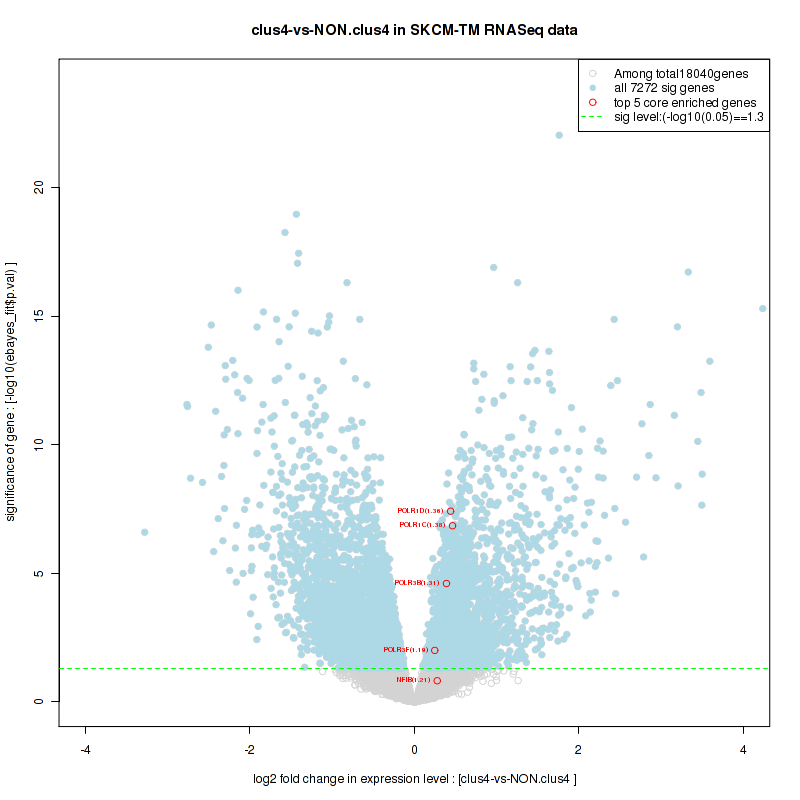Figure S80.  Get High-res Image For the top 5 core enriched genes in the pathway: REACTOME FORMATION OF THE TERNARY COMPLEX AND SUBSEQUENTLY THE 43S COMPLEX, this volcano plot shows how much they are up/down-regulated and significant. The significance was calculated by empirical bayesian fit