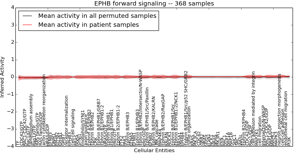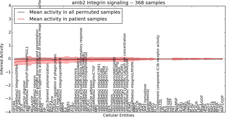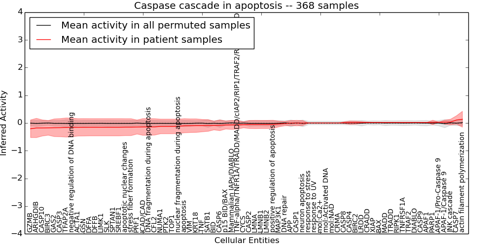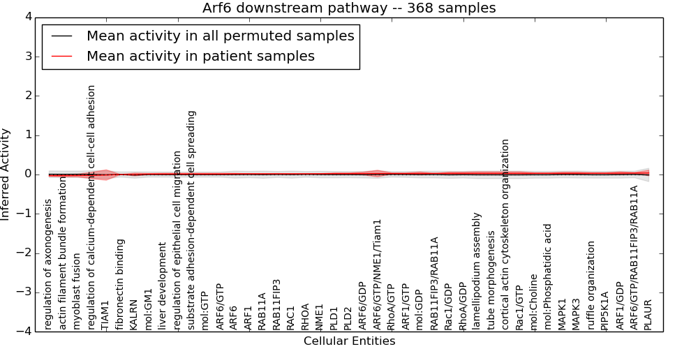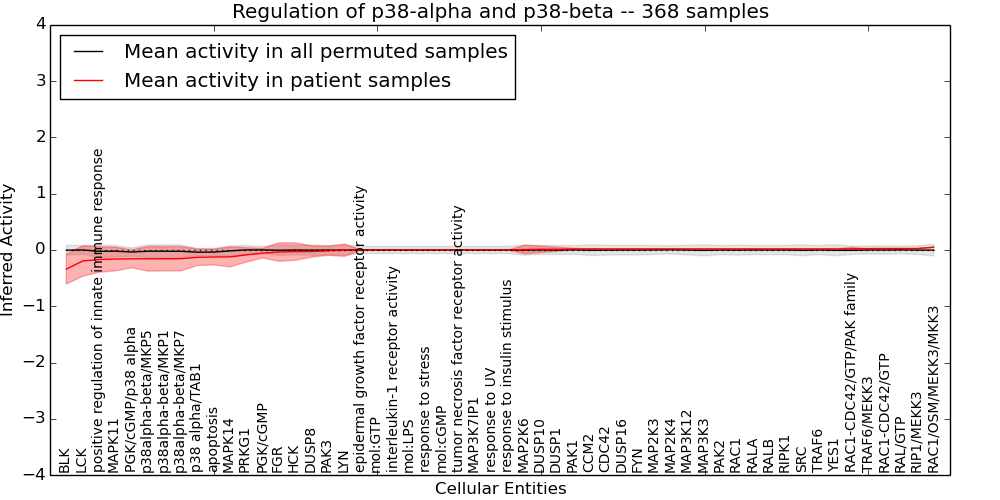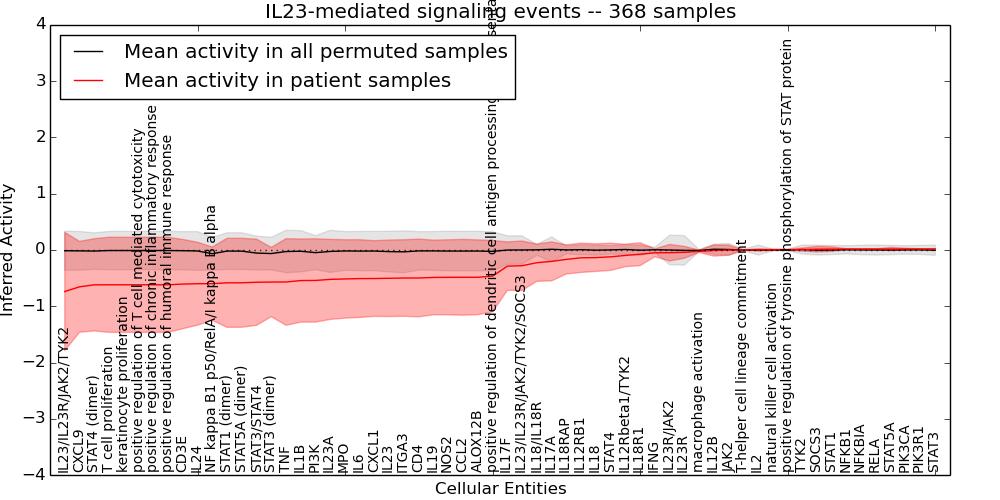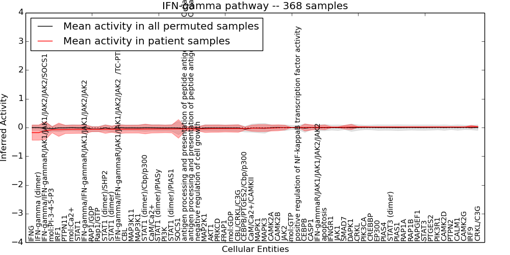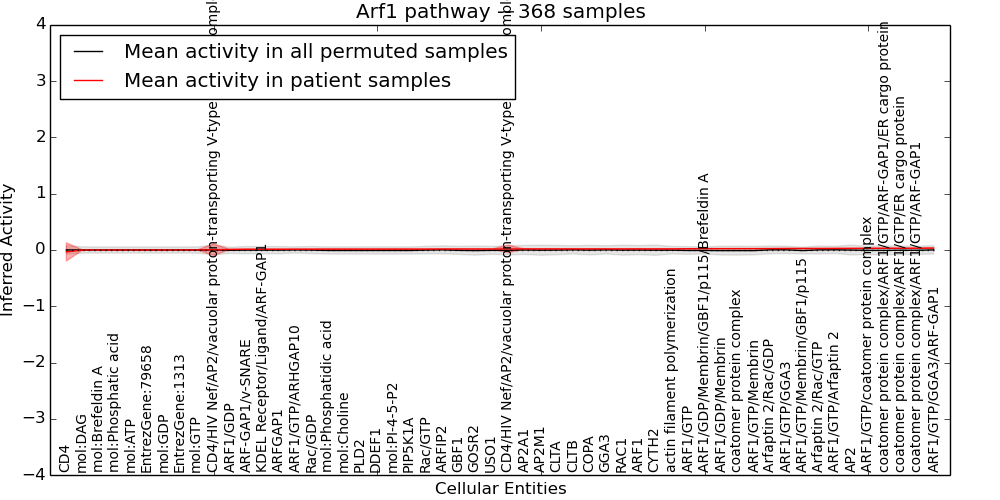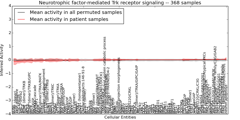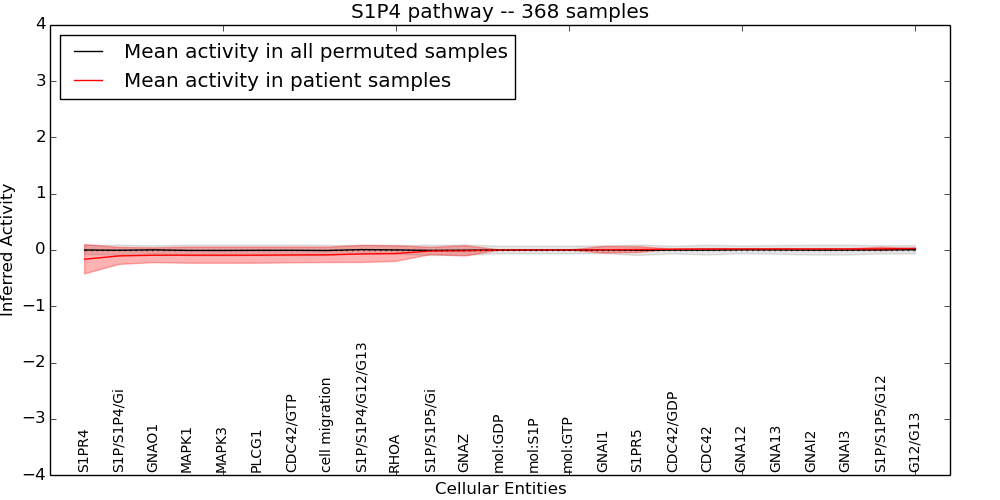 Figure S131. Get High-res Image This plot shows pathway concept perturbations across all samples against a permutation model. The concepts along the x-axis are sorted by lowest to highest mean activity for the real patient samples. Mean inferred activities are plotted along the y-axis as a colored band showing the average level and one standard deviation range. Real samples are shown in red and permuted samples in black.