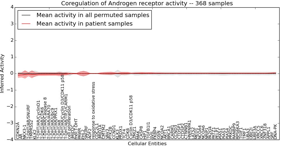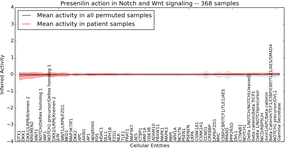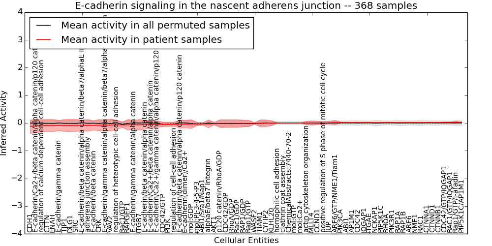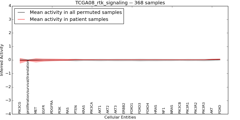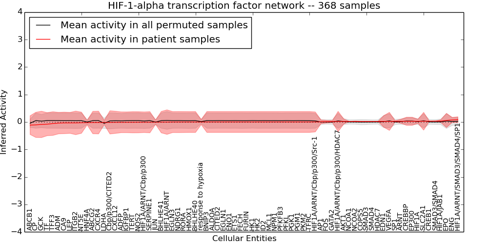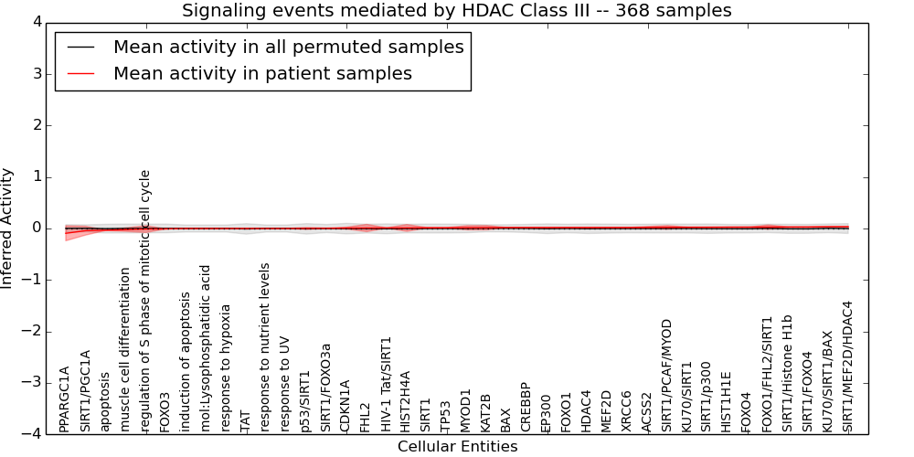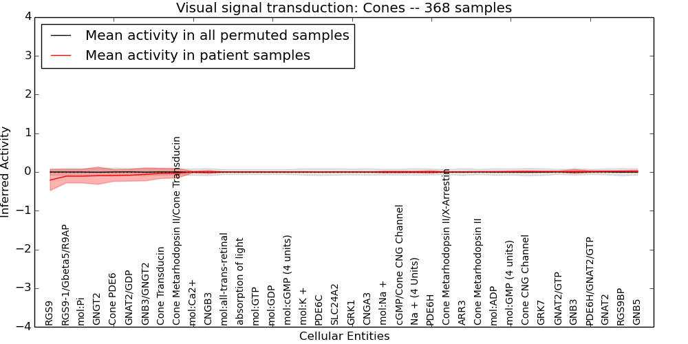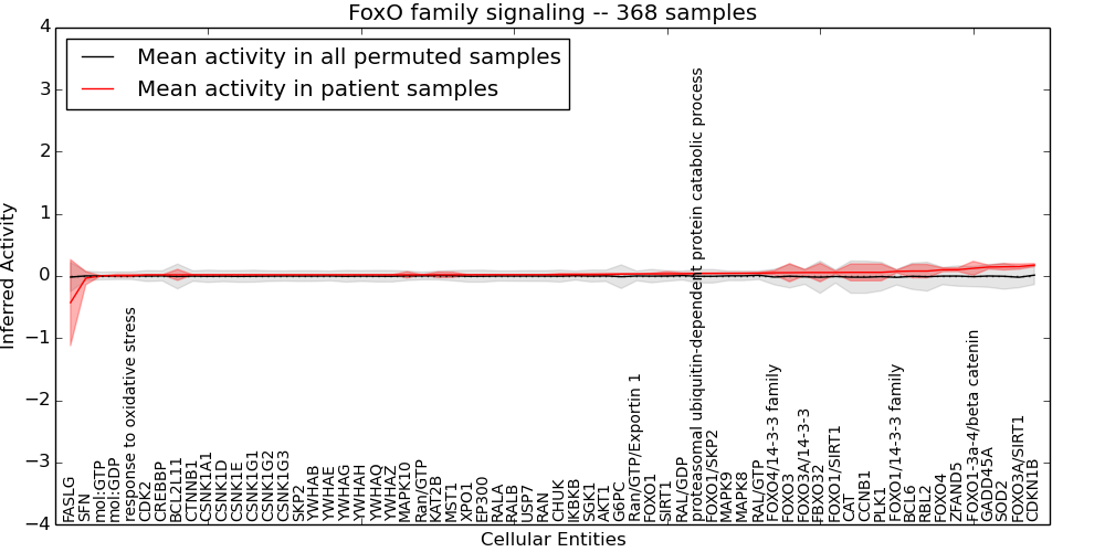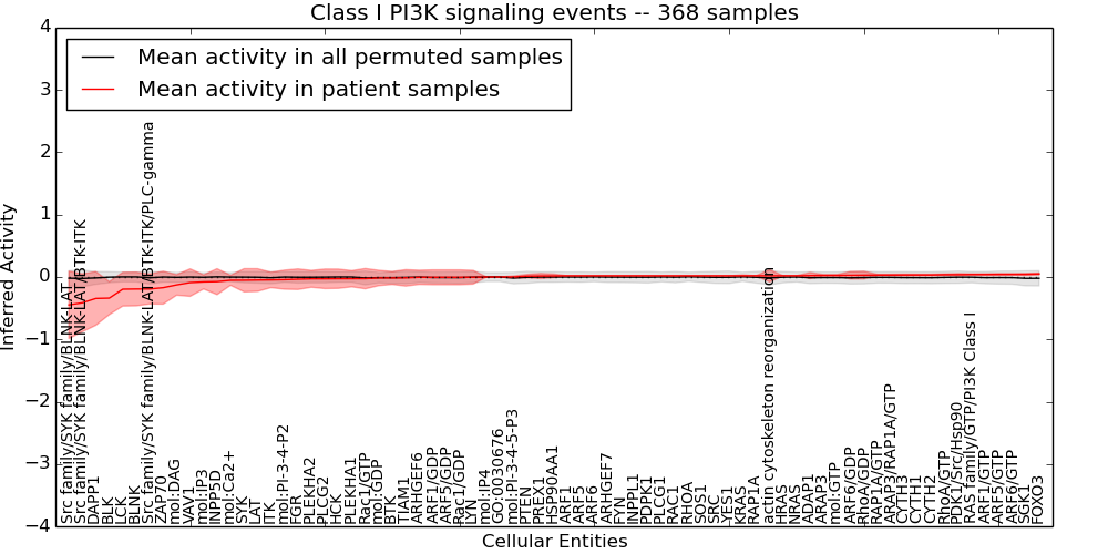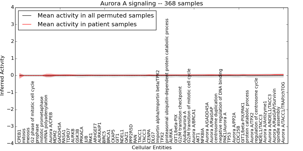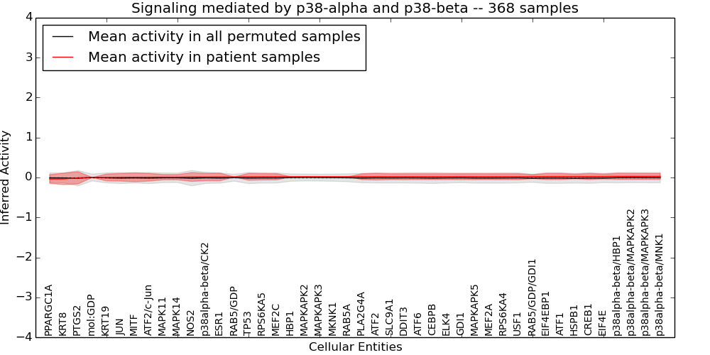 Figure S131. Get High-res Image This plot shows pathway concept perturbations across all samples against a permutation model. The concepts along the x-axis are sorted by lowest to highest mean activity for the real patient samples. Mean inferred activities are plotted along the y-axis as a colored band showing the average level and one standard deviation range. Real samples are shown in red and permuted samples in black.