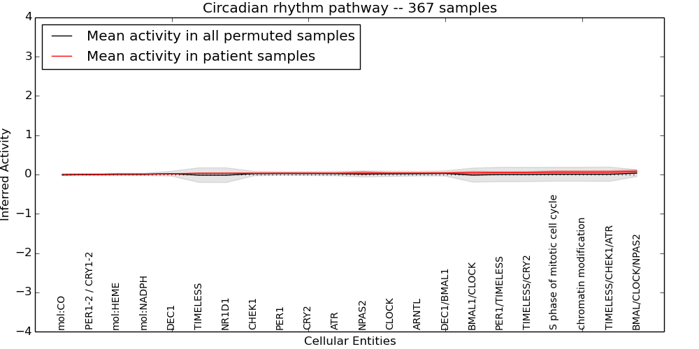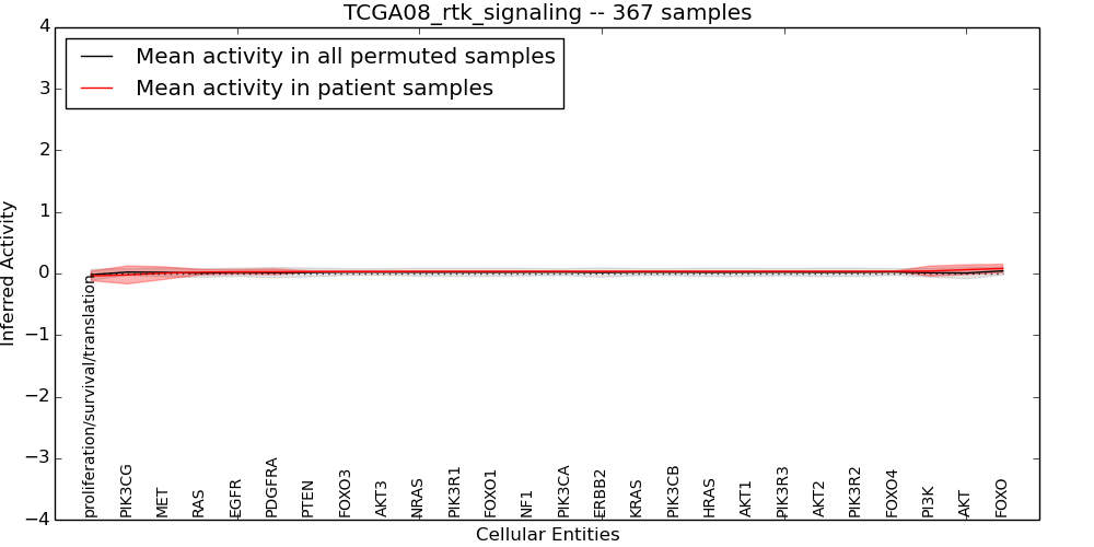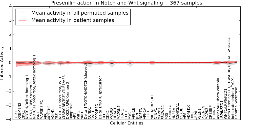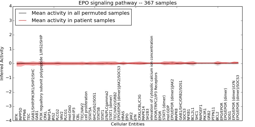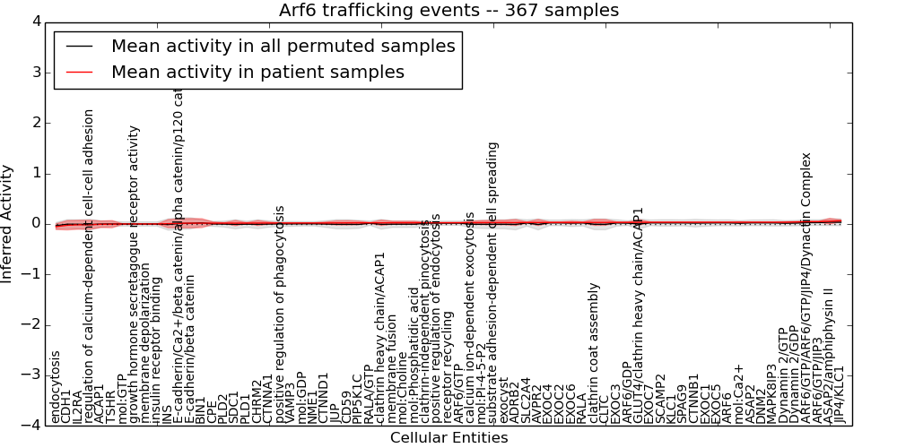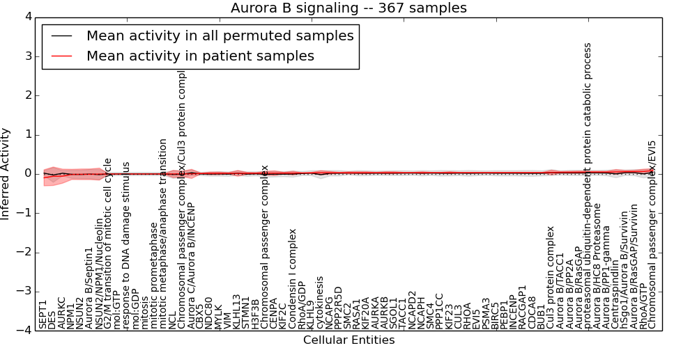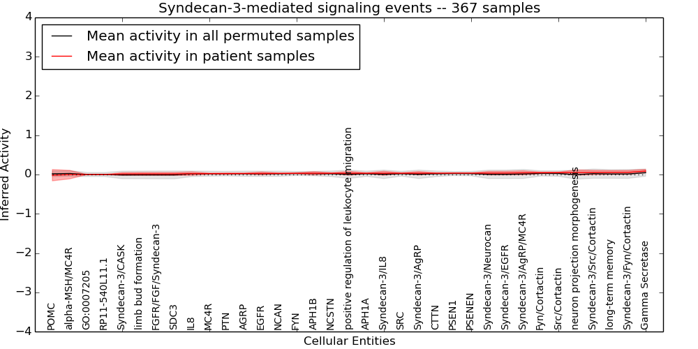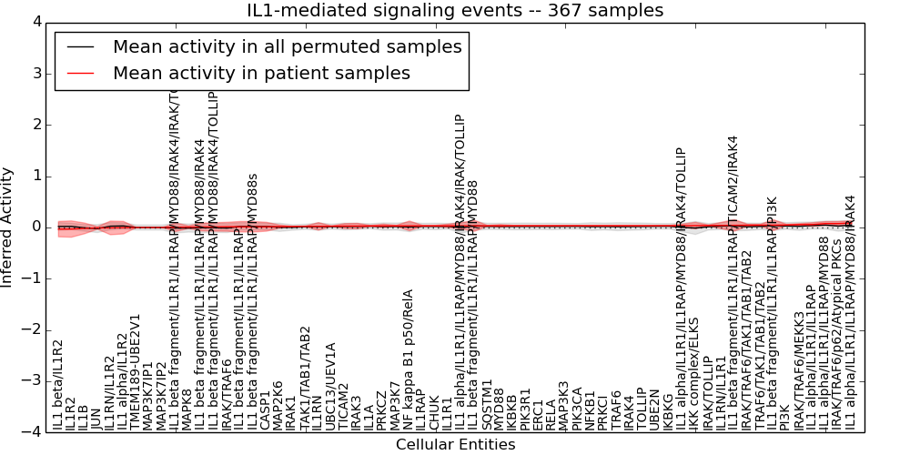 Figure S131.  Get High-res Image This plot shows pathway concept perturbations across all samples against a permutation model. The concepts along the x-axis are sorted by lowest to highest mean activity for the real patient samples. Mean inferred activities are plotted along the y-axis as a colored band showing the average level and one standard deviation range. Real samples are shown in red and permuted samples in black.