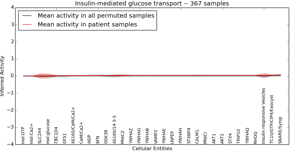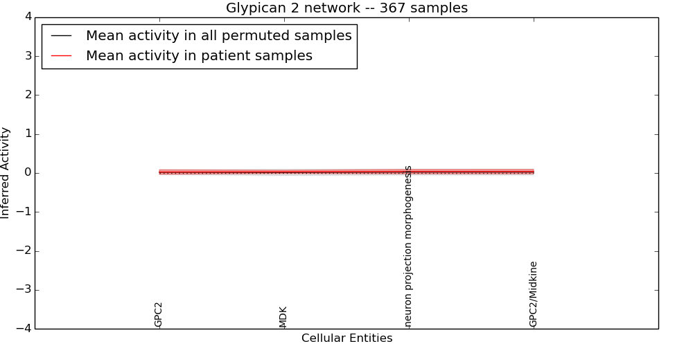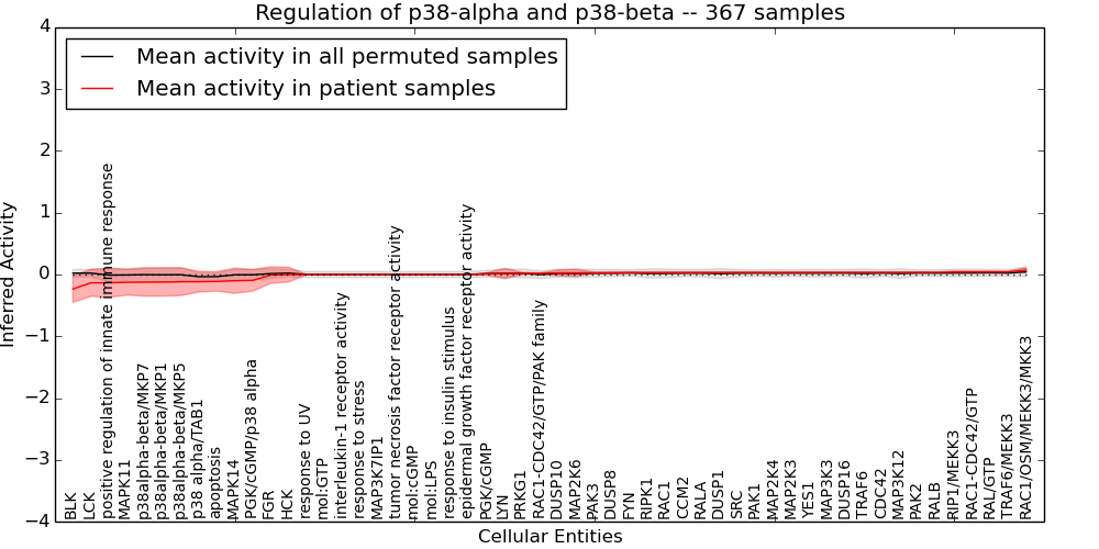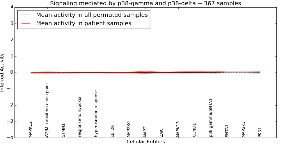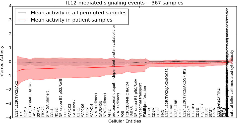 Figure S128.  Get High-res Image This plot shows pathway concept perturbations across all samples against a permutation model. The concepts along the x-axis are sorted by lowest to highest mean activity for the real patient samples. Mean inferred activities are plotted along the y-axis as a colored band showing the average level and one standard deviation range. Real samples are shown in red and permuted samples in black.