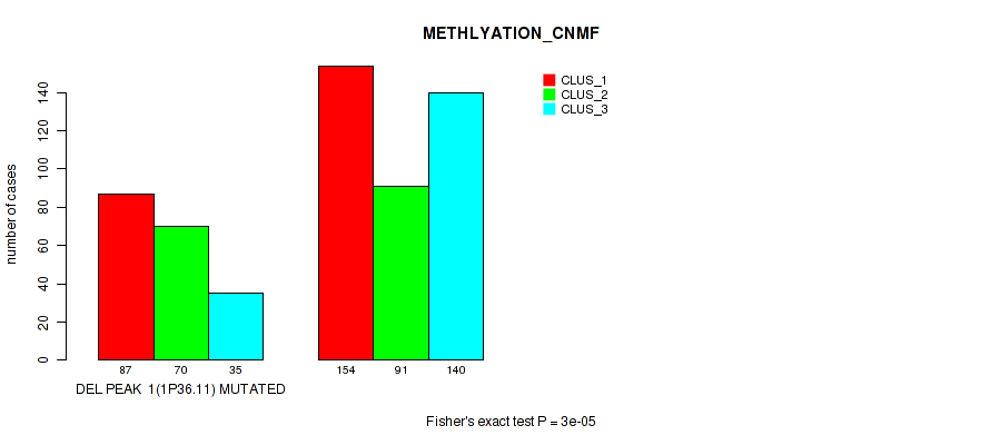 • del_1p36.11 cnv correlated to 'CN_CNMF',  'METHLYATION_CNMF',  'RPPA_CNMF',  'RPPA_CHIERARCHICAL',  'MRNASEQ_CNMF',  'MRNASEQ_CHIERARCHICAL',  'MIRSEQ_CNMF',  'MIRSEQ_CHIERARCHICAL',  'MIRSEQ_MATURE_CNMF', and 'MIRSEQ_MATURE_CHIERARCHICAL'.