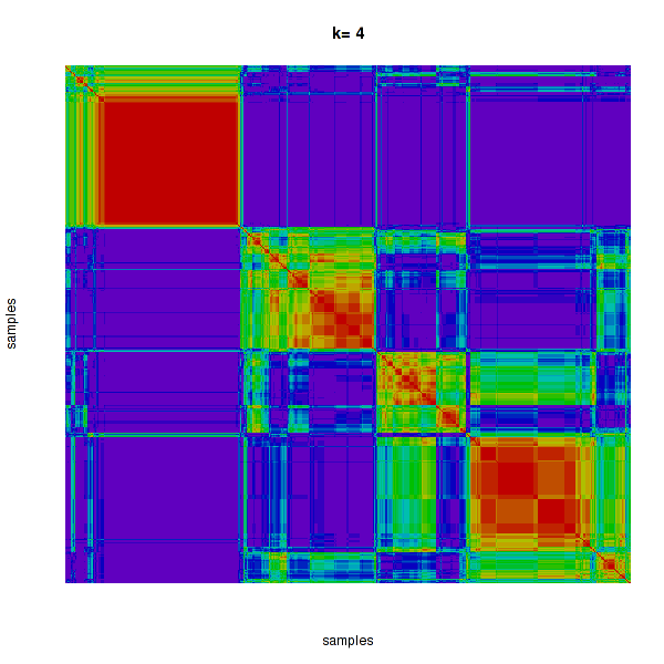 Figure 4. Get High-res Image The consensus matrix after clustering shows 4 clusters with limited overlap between clusters.