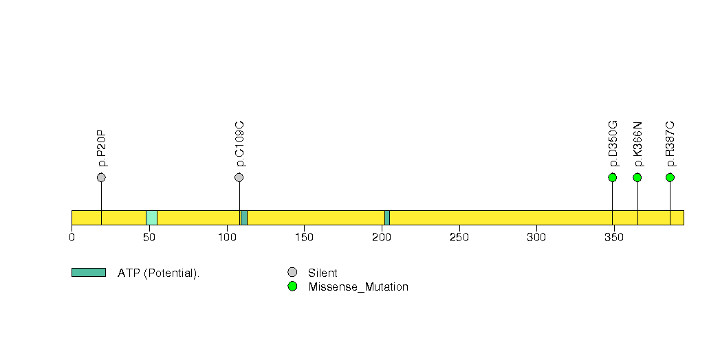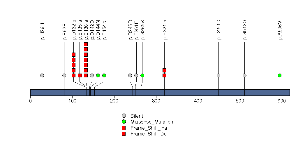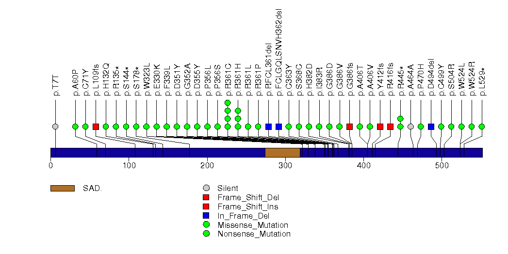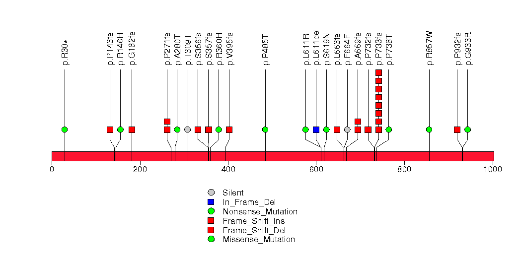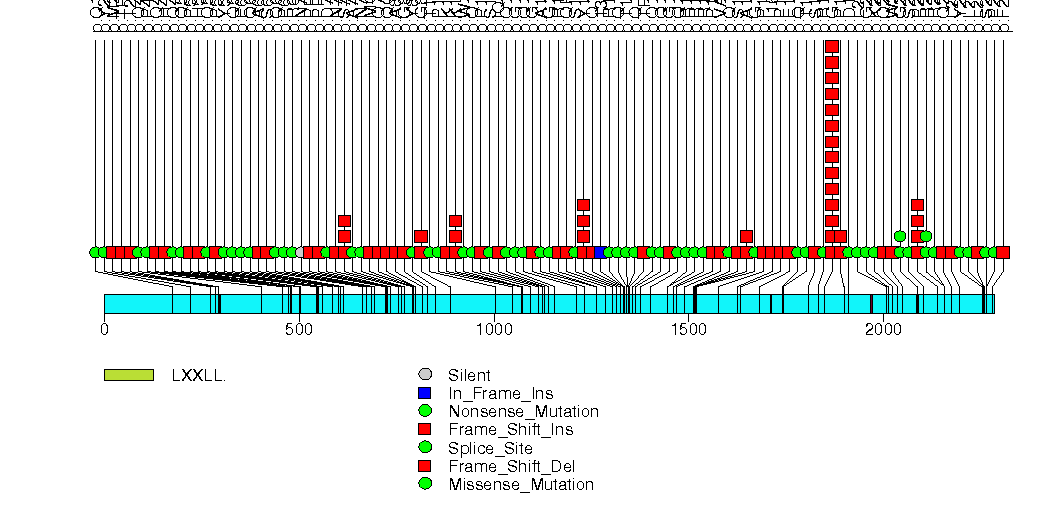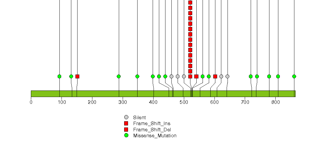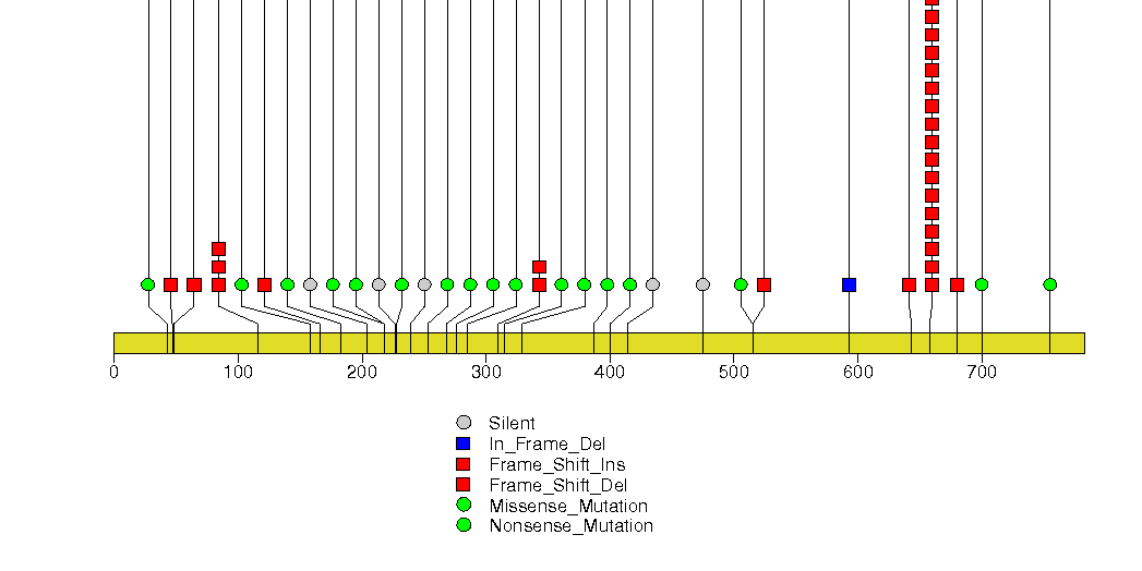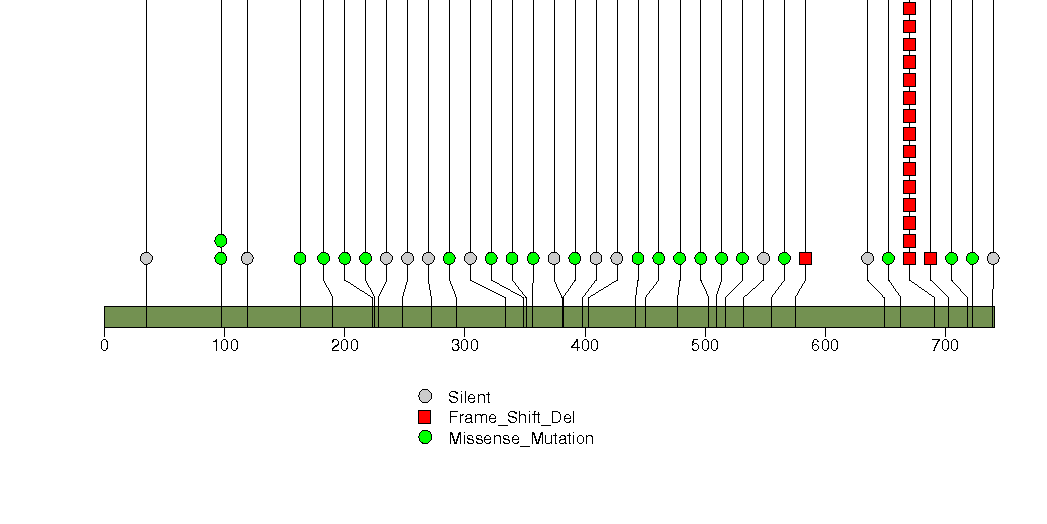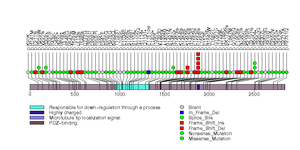 Figure S23. This figure depicts the distribution of mutations and mutation types across the APC significant gene.