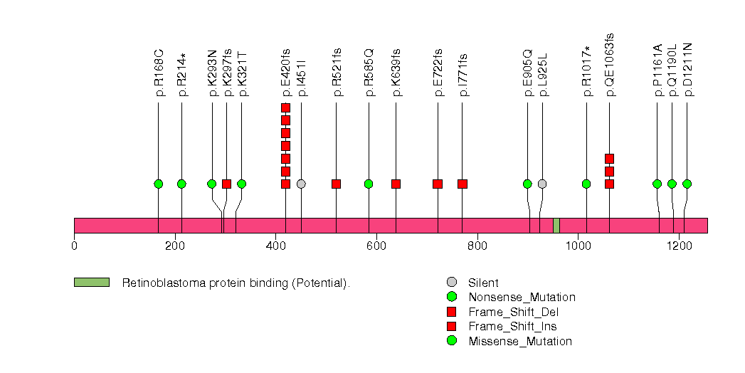 Figure S19. This figure depicts the distribution of mutations and mutation types across the MBD6 significant gene.